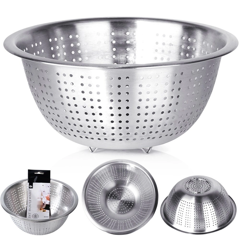 Univerzális, 24 cm átmérőjű rozsdamentes acél szűrő stabil, lábas alappal – ideális gyümölcs és zöldség mosásához, valamint tészta, rizs vagy gombócok szűréséhez. A tartós rozsdamentes acél hosszú élettartamot, a stabil kivitel biztonságos használatot, a könnyű karbantartás pedig egyszerű kezelést biztosít minden konyhában.