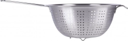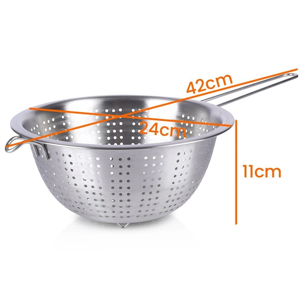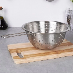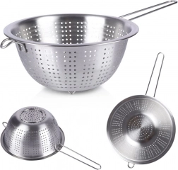 Praktikus, 24 cm átmérőjű rozsdamentes acél szűrő hosszú nyéllel és stabil lábakkal, ideális a mindennapi konyhai munkákhoz. Kiválóan alkalmas tészta leszűrésére, gyümölcs és zöldség átöblítésére, valamint rizshez. A minőségi rozsdamentes acélnak köszönhetően tartós, könnyen tisztítható, kényelmes fogású, és fel is akasztható.