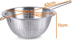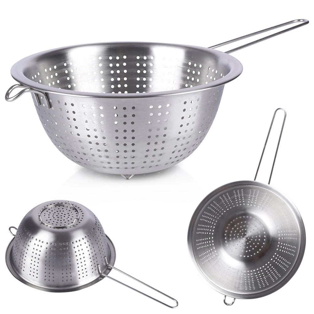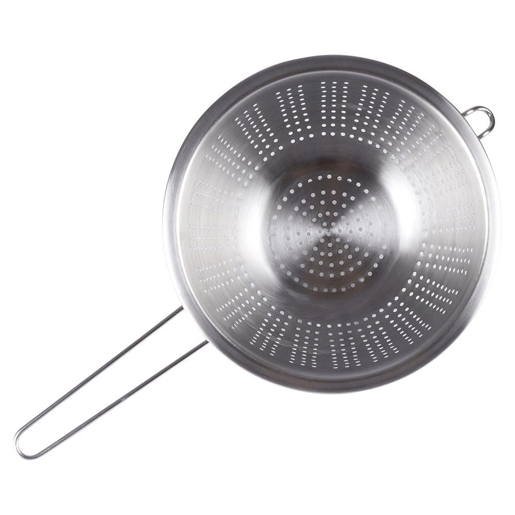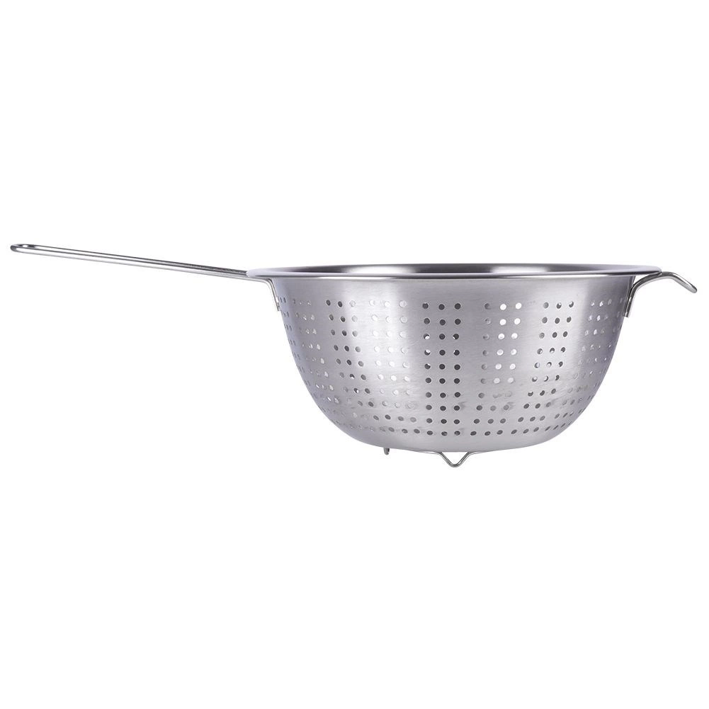 A lábak szilárdan a helyén tartják a szűrőt, a sűrű perforáció pedig gyors vízlefolyást biztosít tészta, zöldség és gyümölcs szűrésénél.
