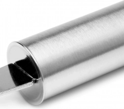 Az ergonomikus, hengeres markolat biztos fogást ad, a végén lévő akasztónyílás pedig megkönnyíti a tárolást a konyhai sínrendszeren.