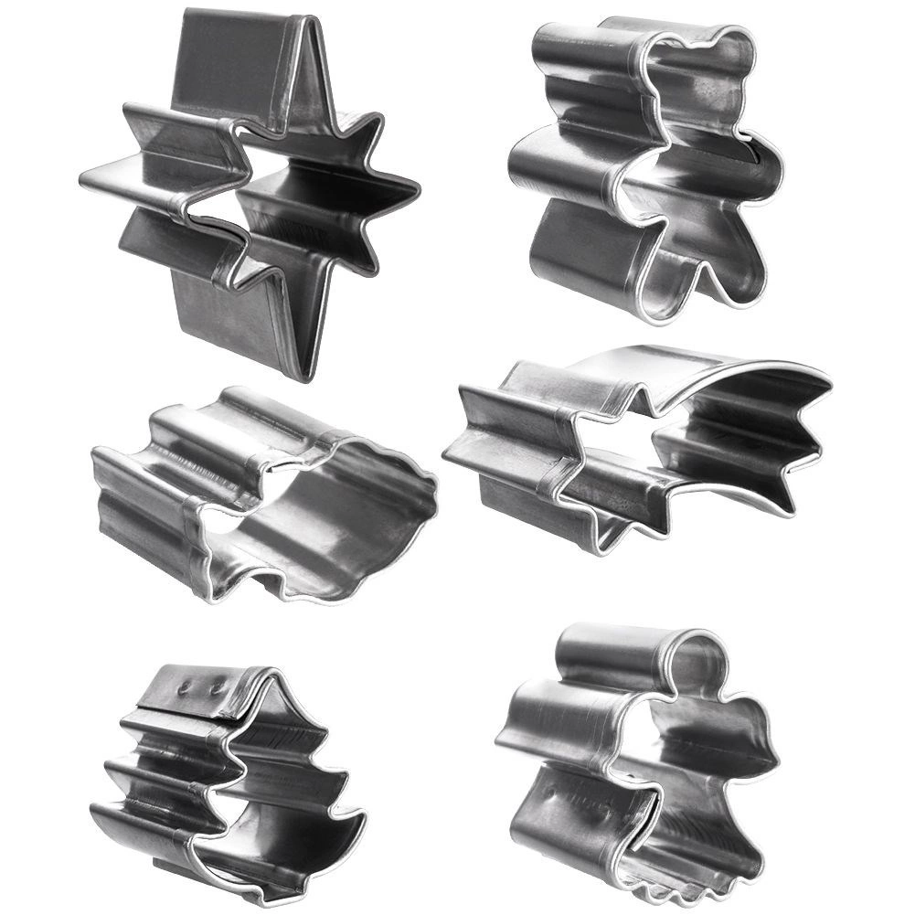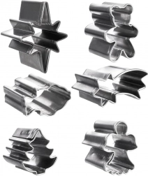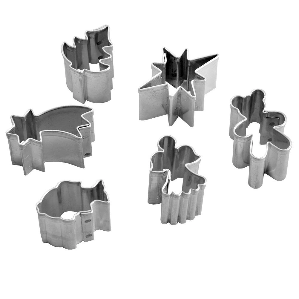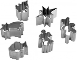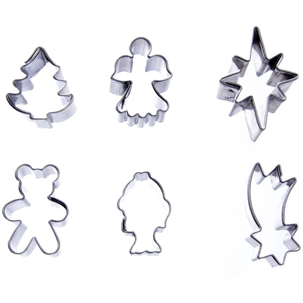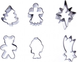 Praktikus készlet hat darab kisméretű karácsonyi kiszúróval, minőségi rozsdamentes acélból a sütemények és torták precíz díszítéséhez. Angyal, fenyő, üstökös, csillag, ponty és mackó formákat tartalmaz. Ideális kekszek közepének kiszúrásához, mézeskalács díszítéséhez, valamint fondant- és marcipándíszek készítéséhez. Tartós rozsdamentes acél, biztonságos peremek, könnyű tisztítás és mosogatógépben mosható kialakítás.