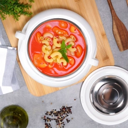 A dupla falú kialakítás rozsdamentes betéttel tovább tartja melegen vagy hidegen az ételt – ideális levesekhez és desszertekhez.