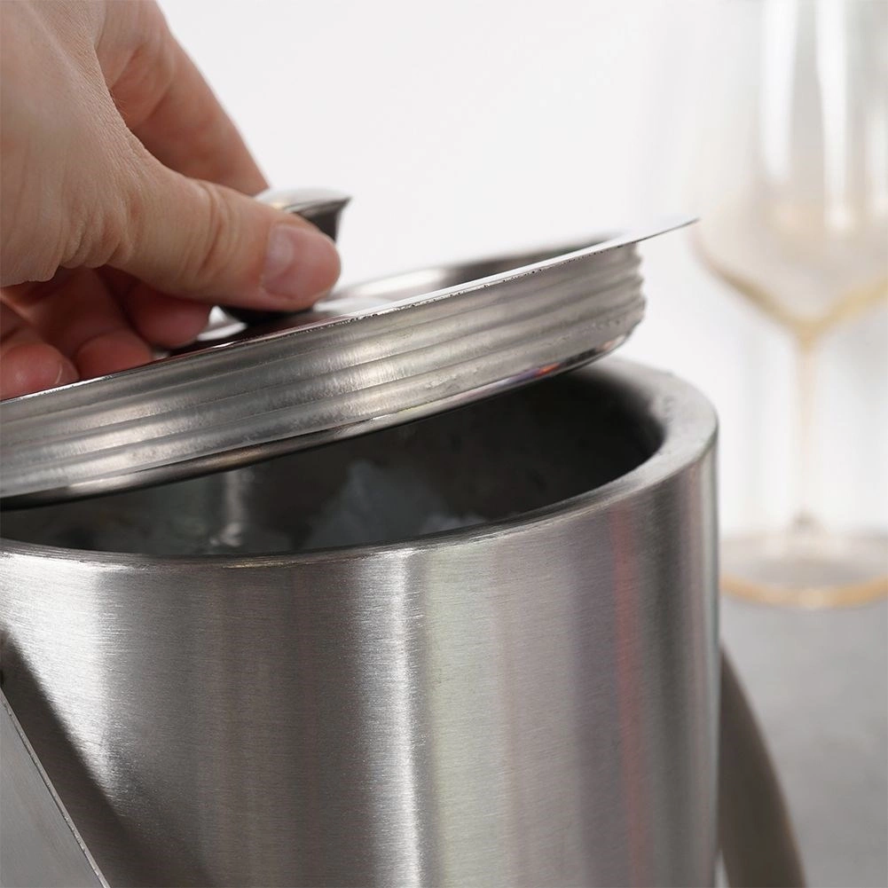 Elegáns és tartós jégvödör matt rozsdamentes acélból, amely hosszabb ideig tökéletesen hidegen tartja a jégkockákat. A dupla falú szigetelésnek köszönhetően termosz jelleggel működik, és lassítja az olvadást. A készlet része a szorosan záródó fedél fogóval és a lehajtható fogantyú a kényelmes hordozáshoz.