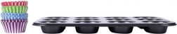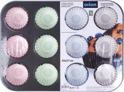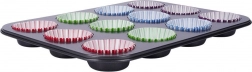 Ez a minőségi muffinform 35 × 27 × 3 cm méretű, 12 egyenletesen elhelyezett mélyedéssel, felső átmérőjük 6,5 cm. A tartós fém tapadásmentes bevonattal könnyű kifordítást biztosít minimális zsiradék mellett is. A csomag része 72 darab papírkapszli különböző színekben a tiszta sütéshez és az esztétikus tálaláshoz.