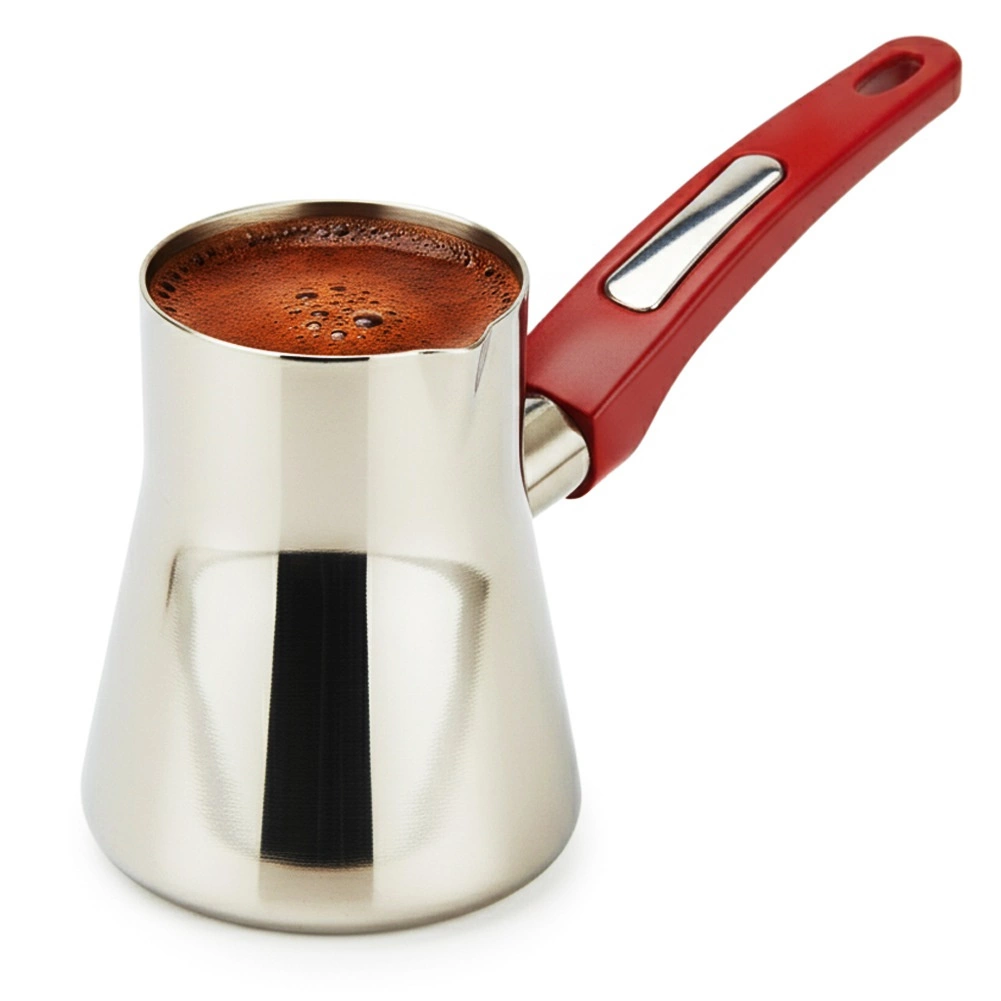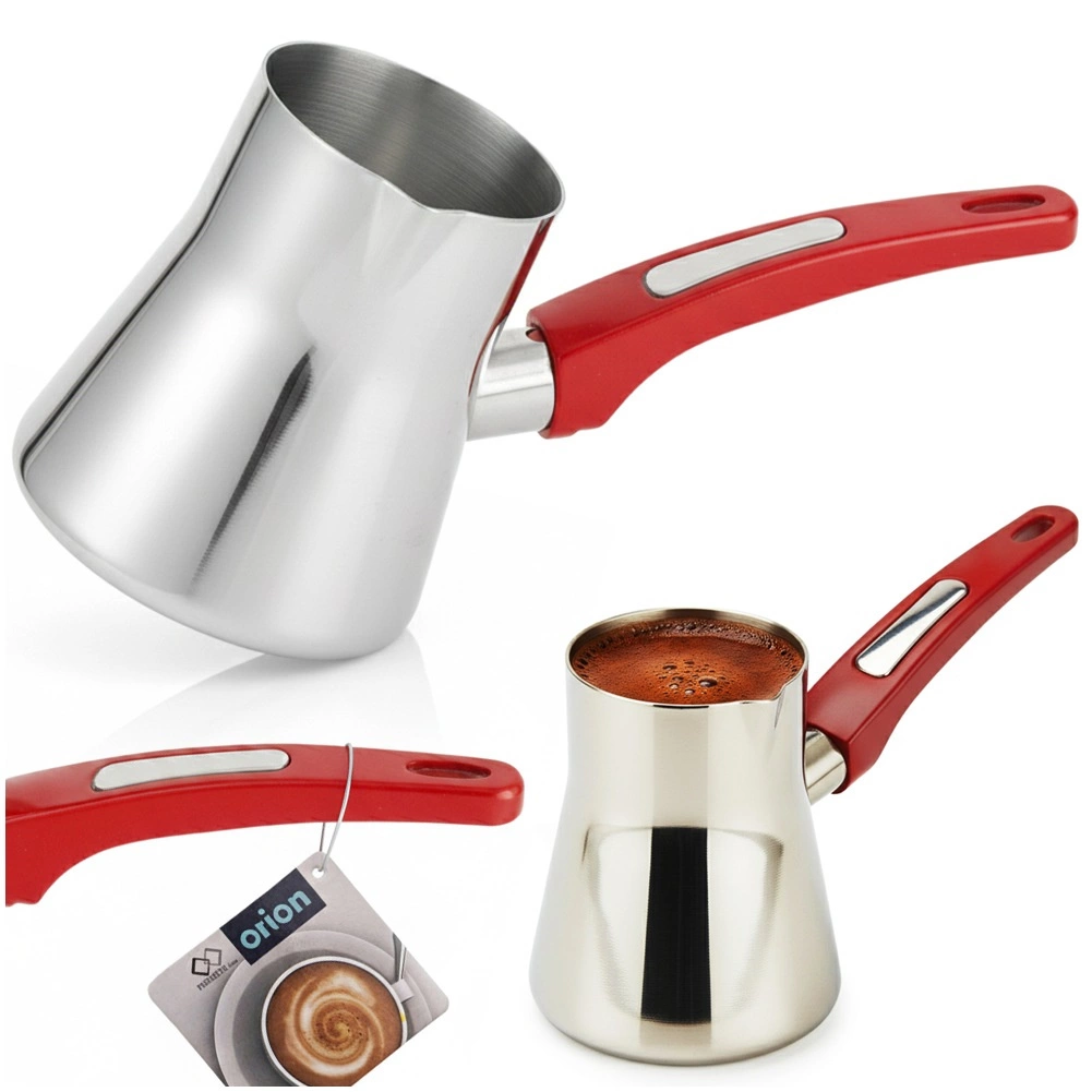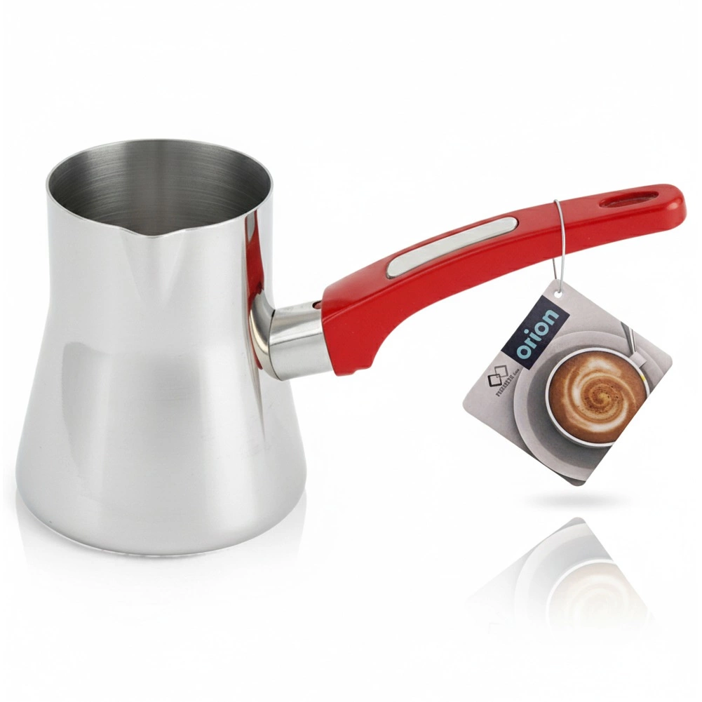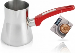Praktikus, 330 ml űrtartalmú rozsdamentes acél török kávéfőző ergonomikus piros nyéllel és kiöntőcsőrrel. Alkalmas gáz-, elektromos és kerámialapos tűzhelyekhez, tej melegítésére is ideális. Minőségi rozsdamentes acélból készül, élelmiszerbiztonságos, mosogatógépben mosható, és speciális csepegésgátló „peremmel” rendelkezik a túlcsordulás ellen.