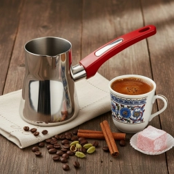 Ez az elegáns rozsdamentes acél kávéfőző (cezve/ibrik) nélkülözhetetlen az autentikus török kávé elkészítéséhez. A 330 ml-es űrtartalom egy-két adaghoz ideális, a praktikus kiöntőcsőr pontos, csöpögésmentes kiöntést biztosít, a piros ergonomikus nyél pedig biztonságos és kényelmes fogást nyújt.