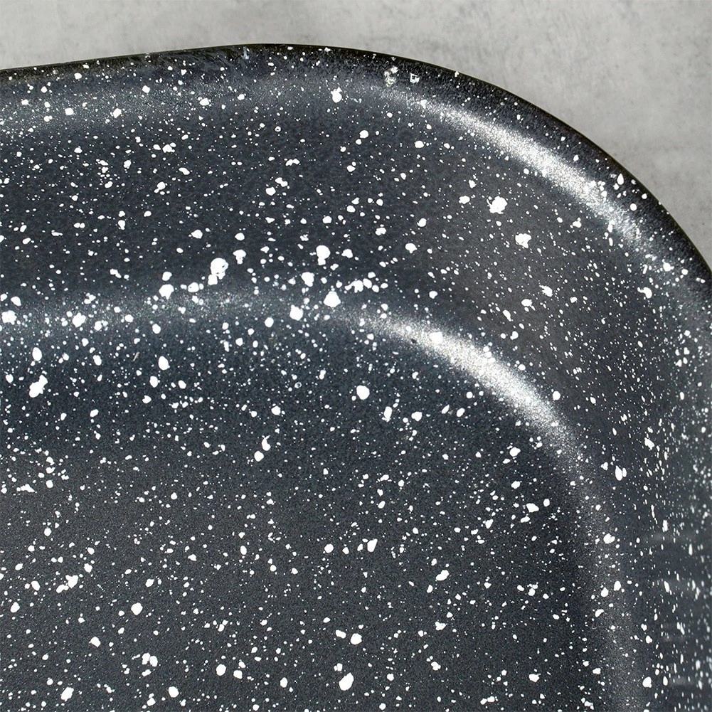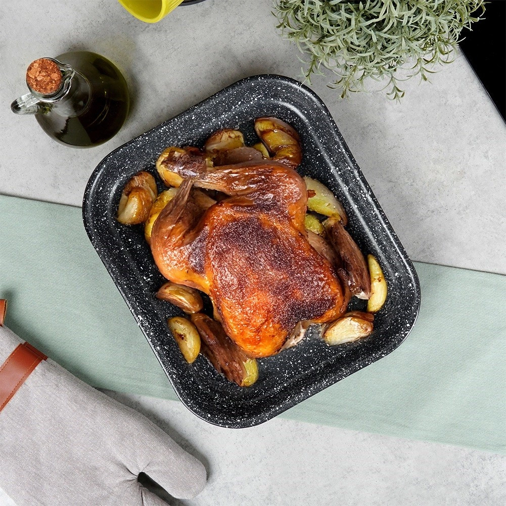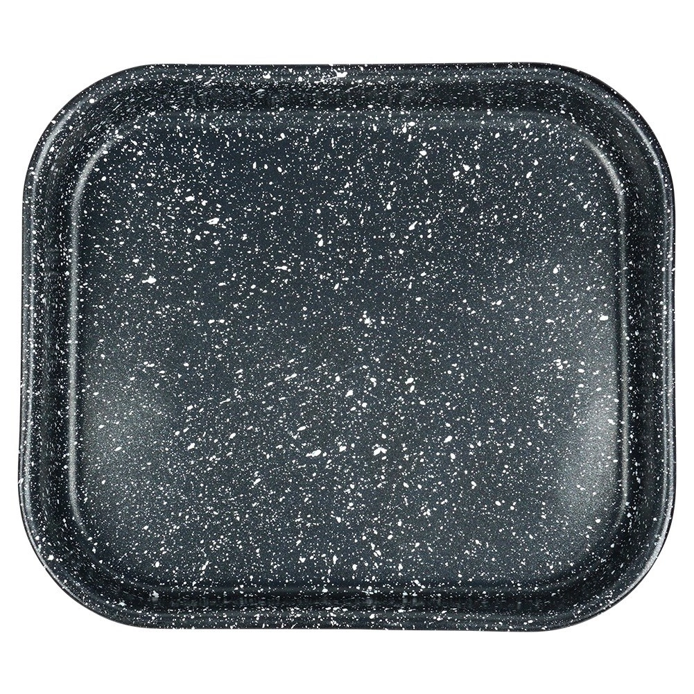 Masszív acél tepsi zománcozott testtel és gránit hatású, rendkívül tartós tapadásmentes felülettel az egyenletes átsülésért és a fogások kényelmes kiemeléséért. A 27 × 23 × 4 cm-es belső méret kiváló csirke, zöldségek, kalácsok és házi pizza sütéséhez.
