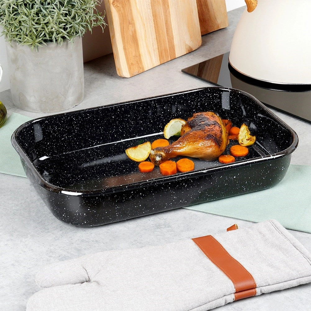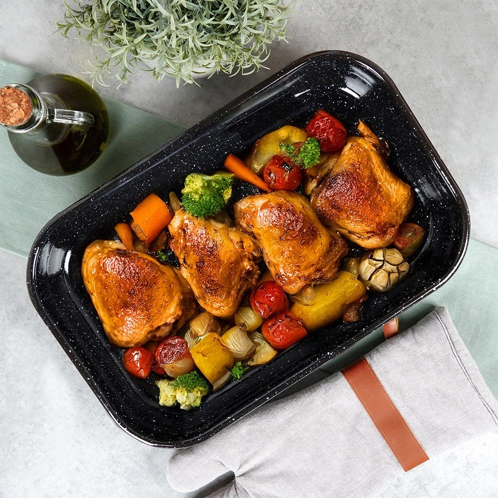 A téglalap alakú, zománcozott acél tepsi tartós, higiénikus, és kiváló hővezetésének köszönhetően egyenletes átsülést biztosít. A zománc egészségkímélő, allergiásoknak is megfelelő. Az univerzális 38 × 24,5 × 7 cm-es méreteknek (belül 36 × 22,5 × 6 cm) köszönhetően alkalmas húsok, zöldségek, felfújtak és desszertek sütésére.