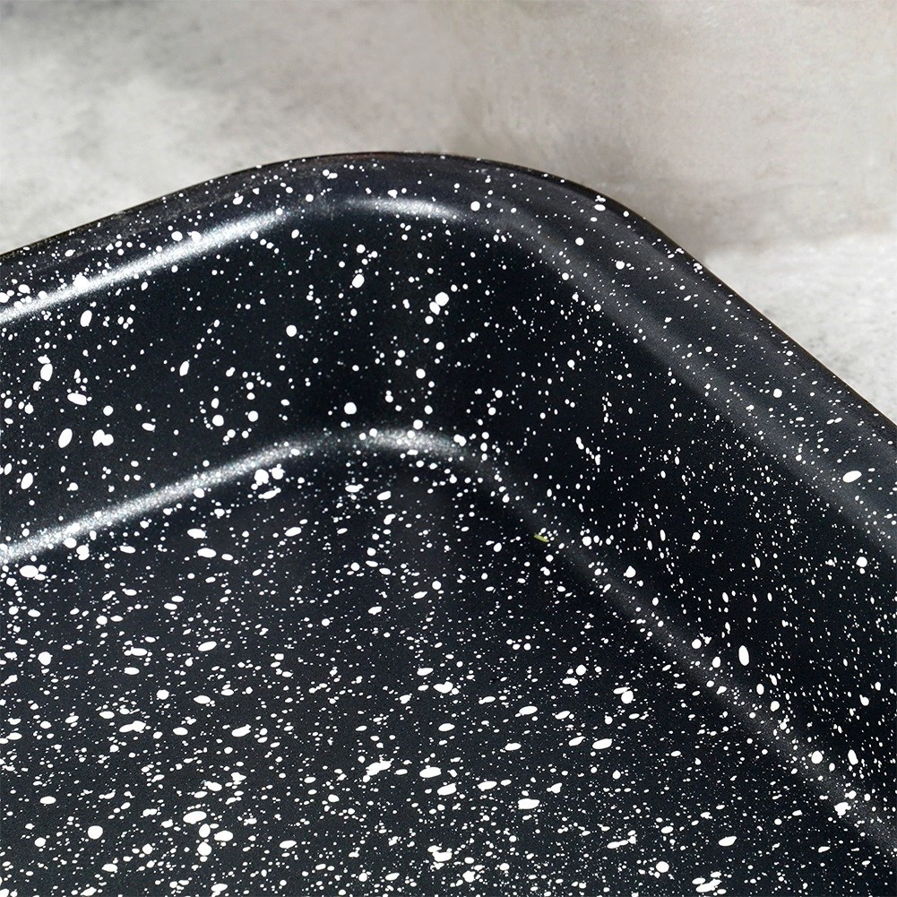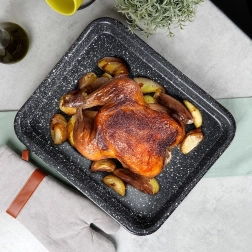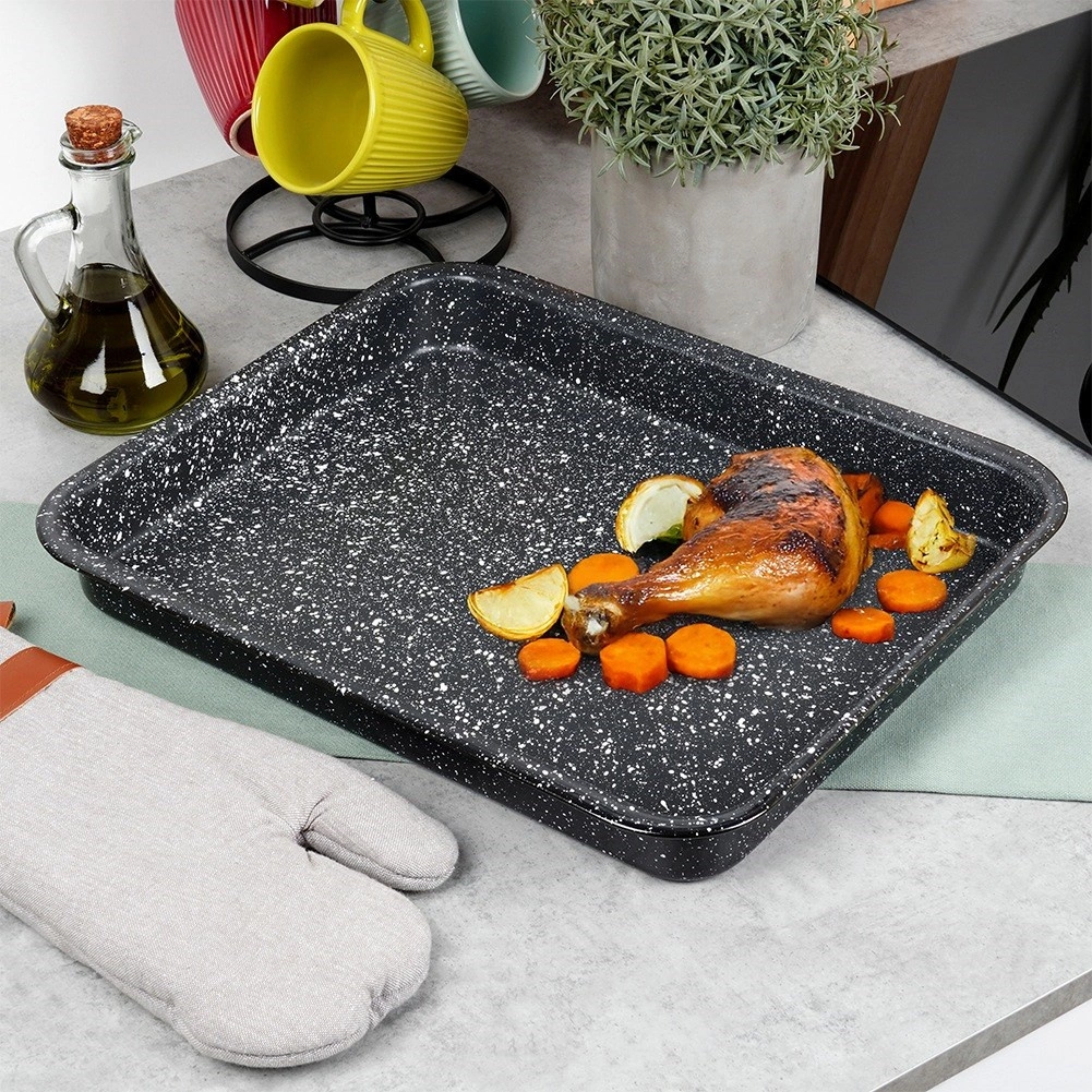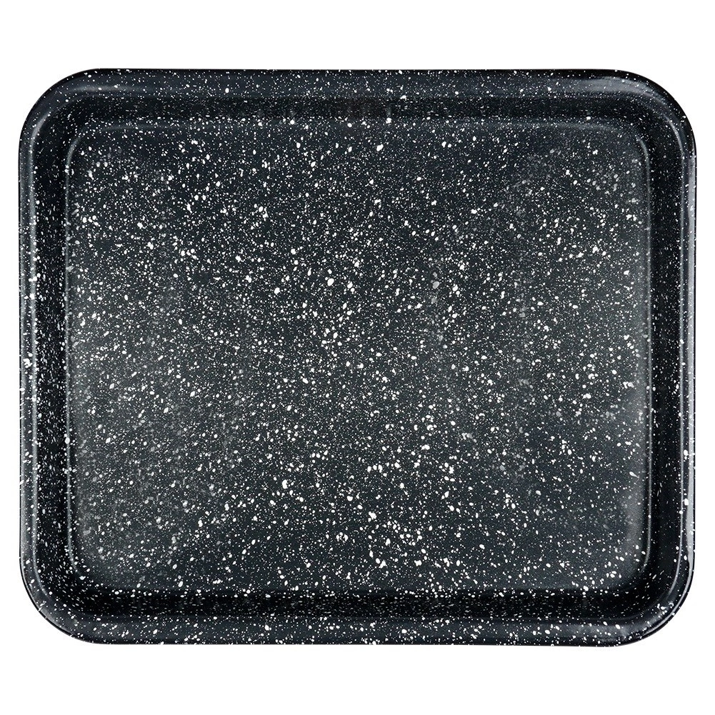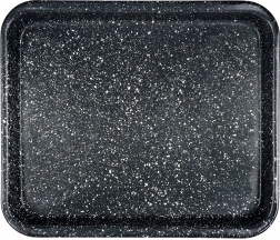 Univerzális tepsi magas peremmel az egyenletes átsülésért és a kényelmes kezelésért. A belső gránit hatású tapadásmentes réteg minimálisra csökkenti az odaégést még kevés zsiradék használata mellett is, és karcálló. A fekete, elegáns zománcozott fém tartós, hosszú távon megtartja alakját.