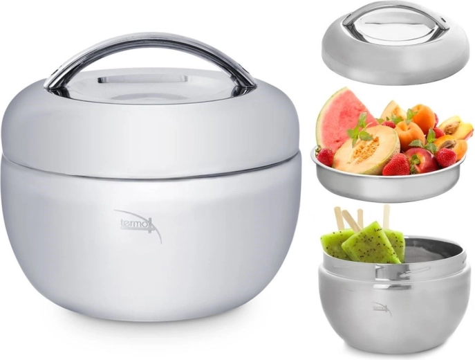 Praktikus termos tál ételhez minőségi rozsdamentes acélból, 1 liter űrtartalommal, amely akár 2 órán át melegen tartja az ételeket, vagy épp hosszabban hidegen. Három részből áll – külső tál, belső tál/tányér és fedél kényelmes fogantyúval. Ideális munkába, útra és otthonra.