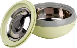 A tető egyszerű elfordítással zárható, az integrált fogantyú megkönnyíti a hordozást. A tál akár 2 órán át tartja a hőt; a hosszabb hatásért melegítse elő a belső részt forró vízzel 1–2 percig. Nyáron hideg desszertek és fagylalt tárolására is használható – jobb hűtéshez előzetesen hűtse le a tálat a hűtőben.