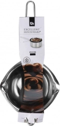 Praktikus, 250 ml űrtartalmú és 14 cm átmérőjű rozsdamentes acél tál kíméletes olvasztáshoz csokoládéhoz, vajhoz vagy viaszhoz vízfürdőben. A hosszú nyélnek, a stabilizáló akasztónak és a kétoldali kiöntőcsőröknek köszönhetően a kiöntés kényelmes és tiszta. Minőségi rozsdamentes acélból készült, élelmiszerbiztonságos és mosogatógépben mosható.