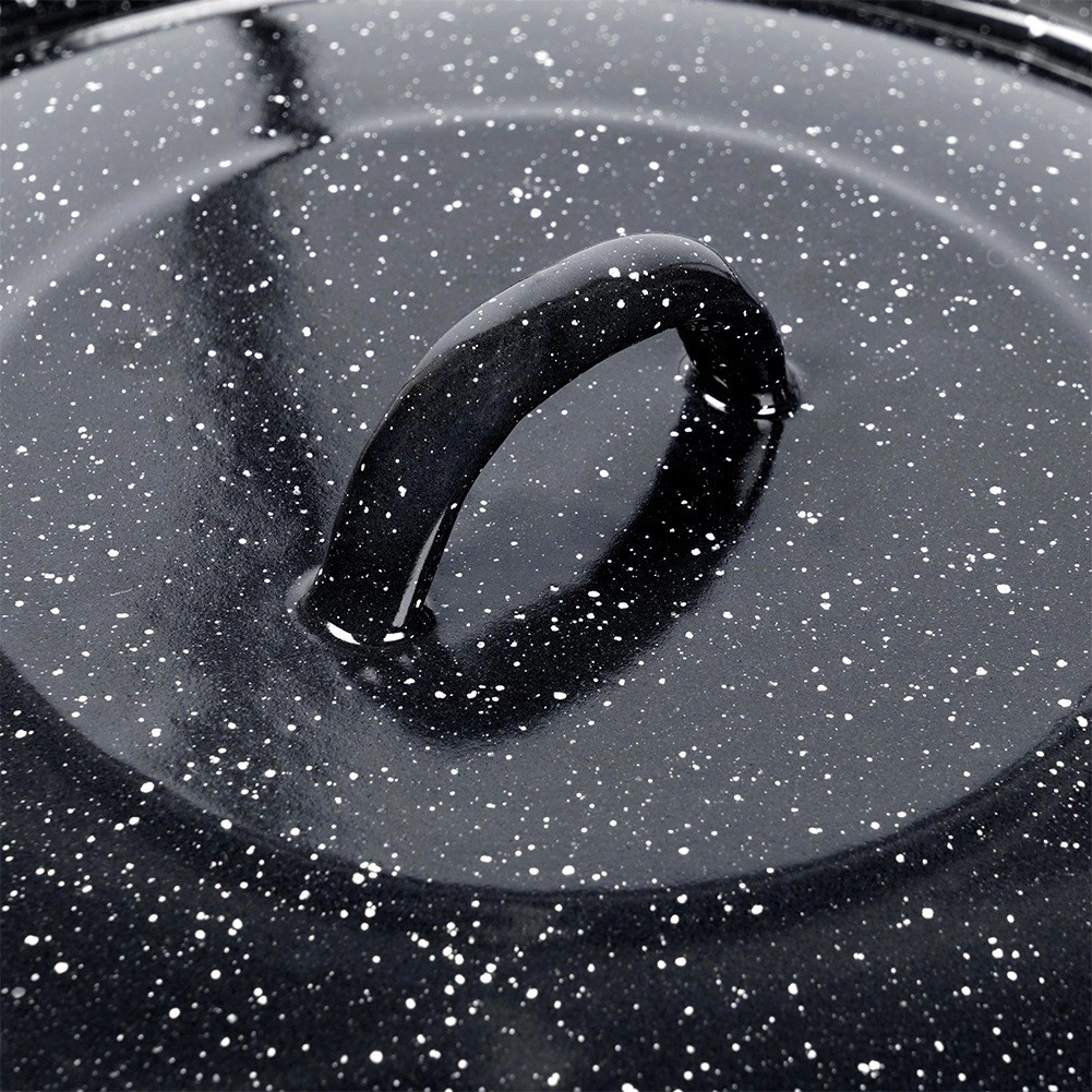 A zománcozott acéltest ellenáll a karcolásoknak és a korróziónak, míg a robusztus fogantyú biztonságos emelést biztosít magasabb hőmérsékleten is. A zománc természetes módon mutathat apró gyártási egyenetlenségeket (kidudorodások, egyenetlen permetezés stb.), amelyek nem befolyásolják a minőséget vagy a funkcionalitást.