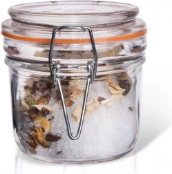 Sokoldalú üveg tároló praktikus patentzárral, amely megbízhatóan védi a tartalmat a nedvességtől és a szennyeződésektől. A narancssárga gumitömítés tökéletes zárást biztosít, így kiváló fűszerekhez, szórható keverékekhez, darált diófélékhez vagy apró gyümölcsökhöz, mint a tőzegáfonya, áfonya és málna.