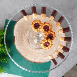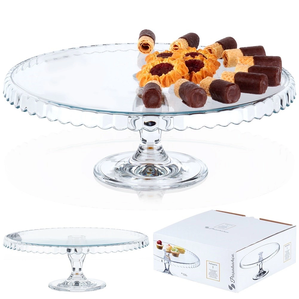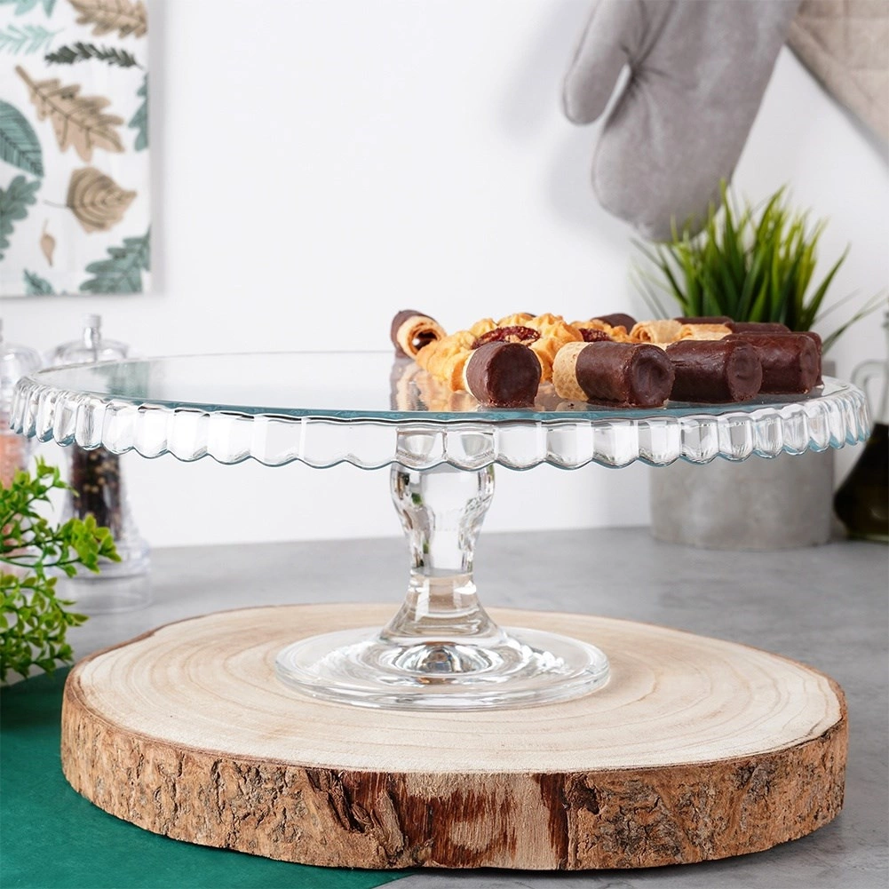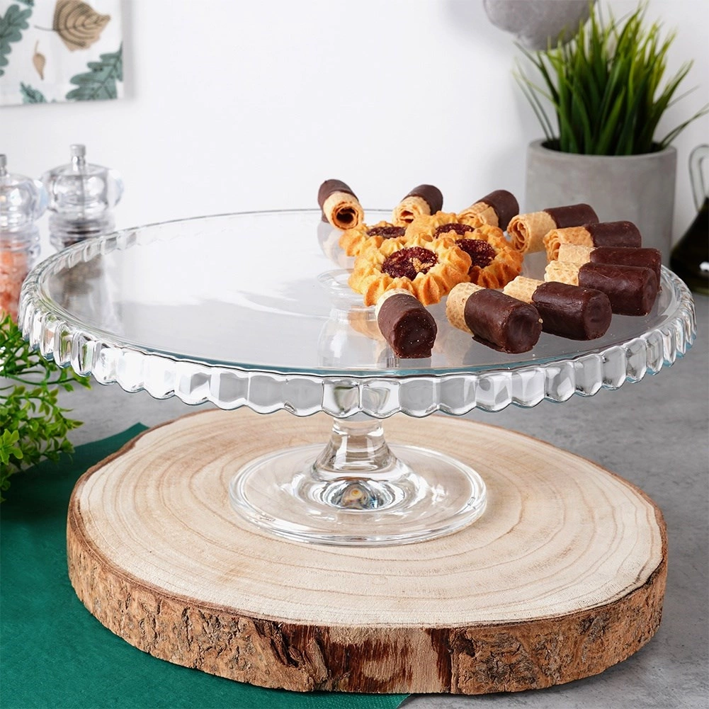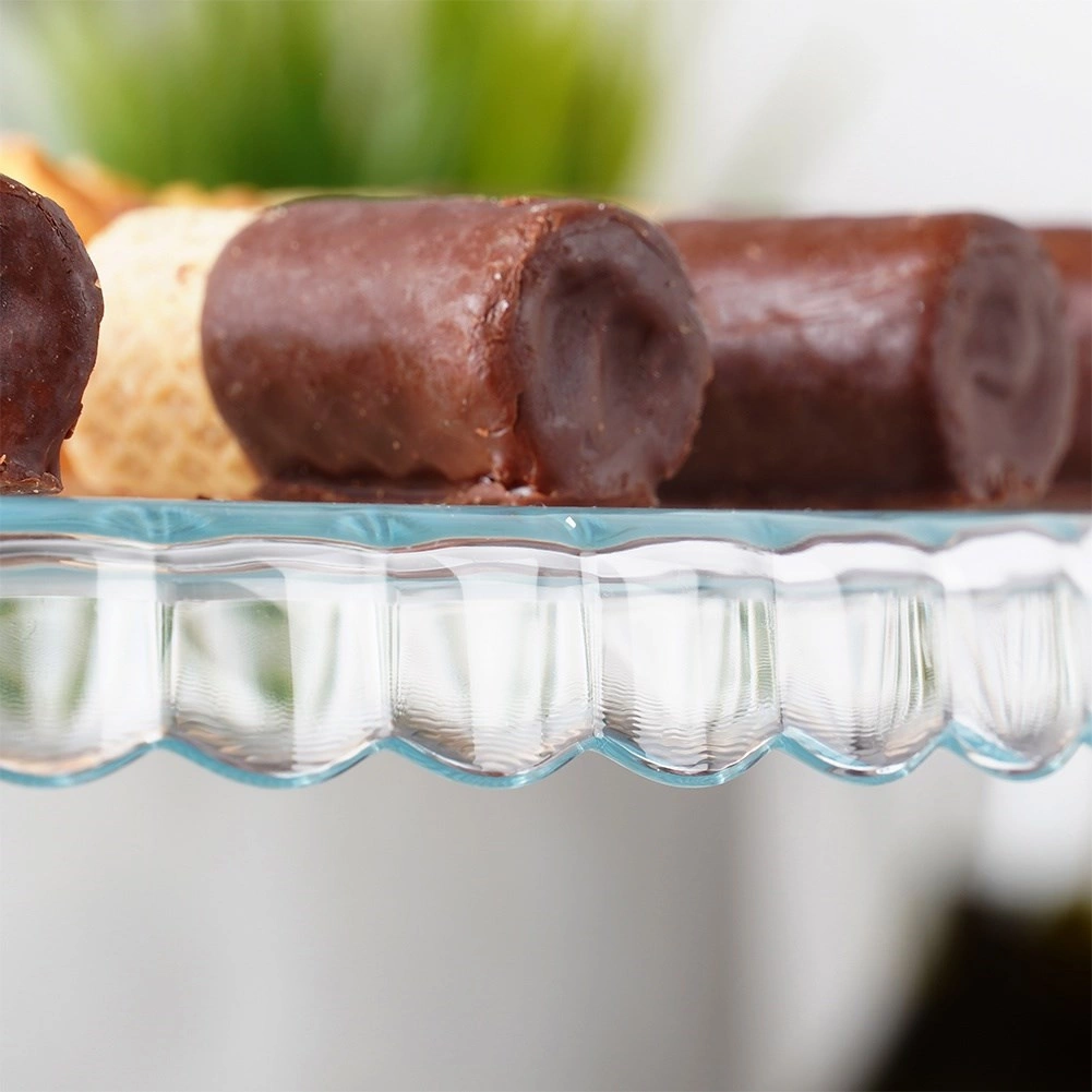A tiszta üveg és a hullámos perem még inkább kiemeli a torták és sütemények megjelenését, amelyek szó szerint beragyogják az asztalt.