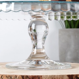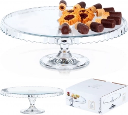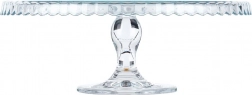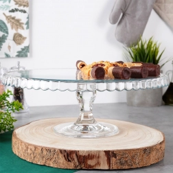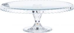 Elegáns, 32 cm átmérőjű üveg tortaállvány hullámos peremmel a stílusos tálaláshoz. Az átlátszó üveg kiemeli a desszertek és falatok szépségét. Stabil talapzat, sokoldalú felhasználás, könnyű karbantartás és időtálló dizájn a hétköznapi és ünnepi terítékhez egyaránt.