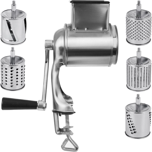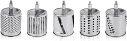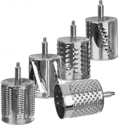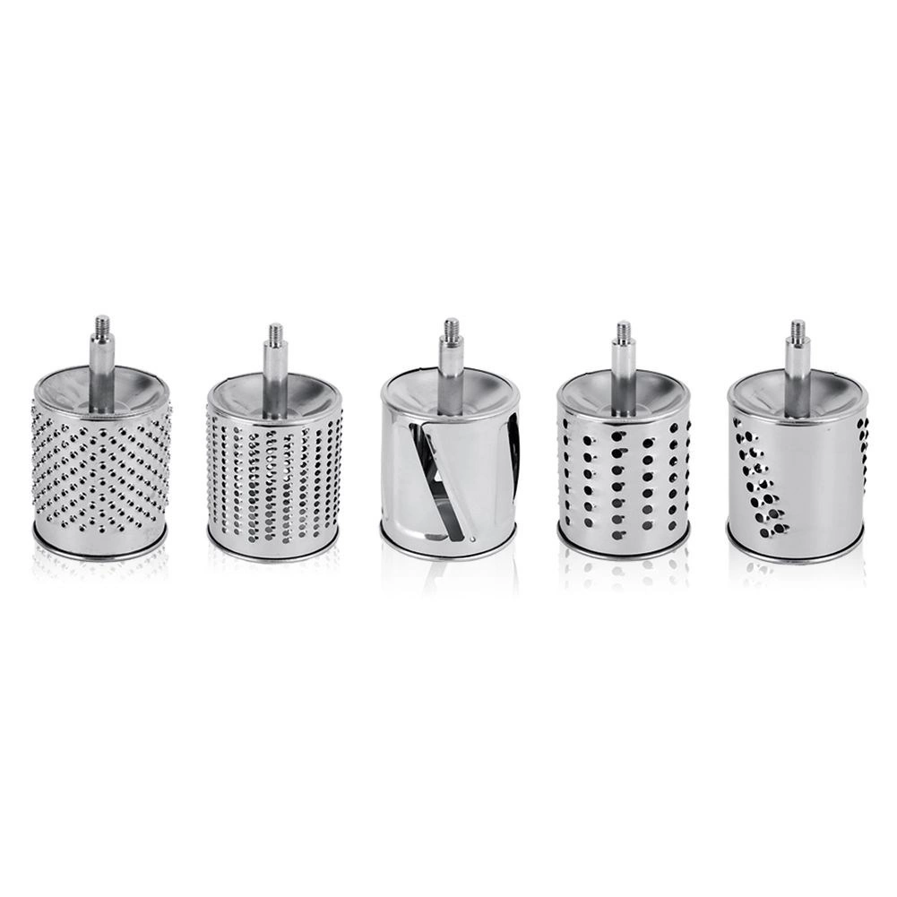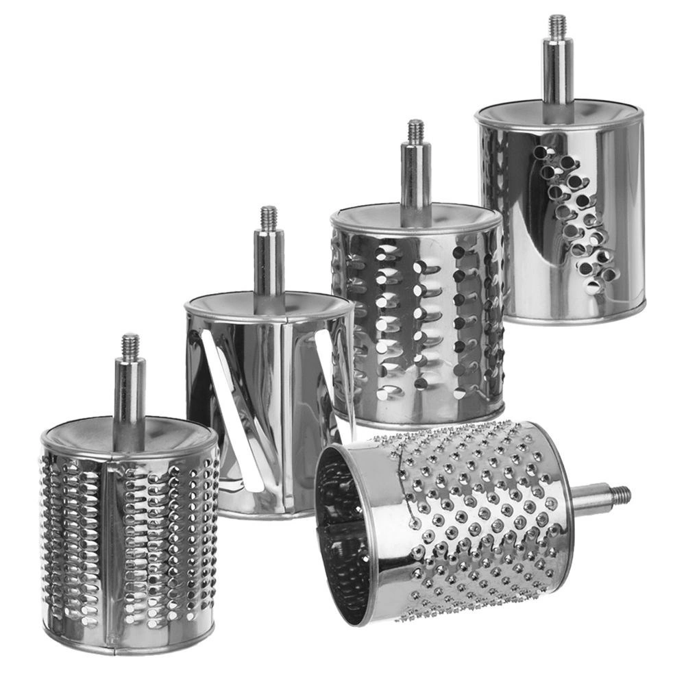 Az 5 rozsdamentes acél dob készlete lefedi a finom és durva reszelést, a szeletelést és az aprítást. Ideális sajt, diófélék, csokoládé, zöldség és gyümölcs feldolgozásához.