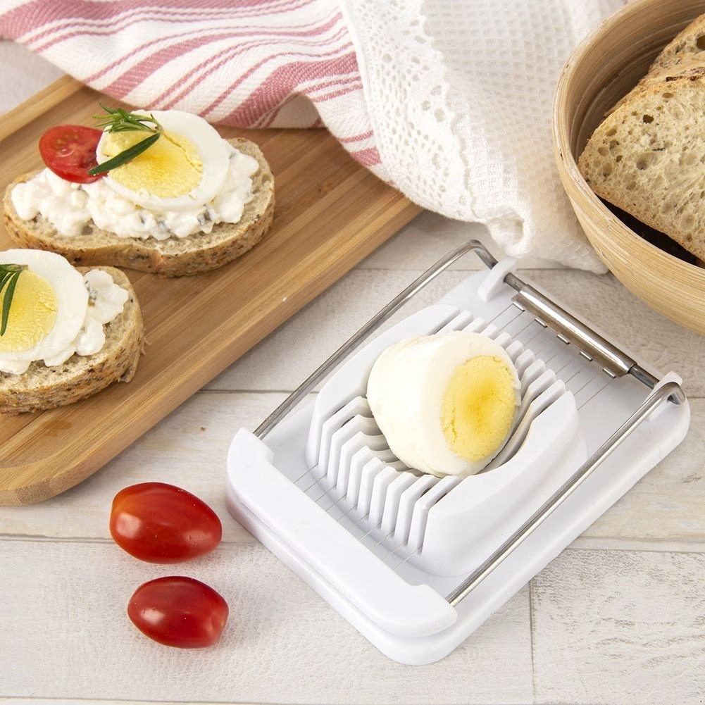 Könnyítse meg saláták, szendvicsek és hidegtálak előkészítését. Ez a tojásszeletelő tartós műanyag alapot kombinál rozsdamentes acél huzalokkal a tiszta vágásokért morzsolódás nélkül. Az ergonomikus kialakítás stabilan tartja a tojást, és egyetlen lenyomással 10 egyenletes szeletet tesz lehetővé.