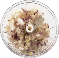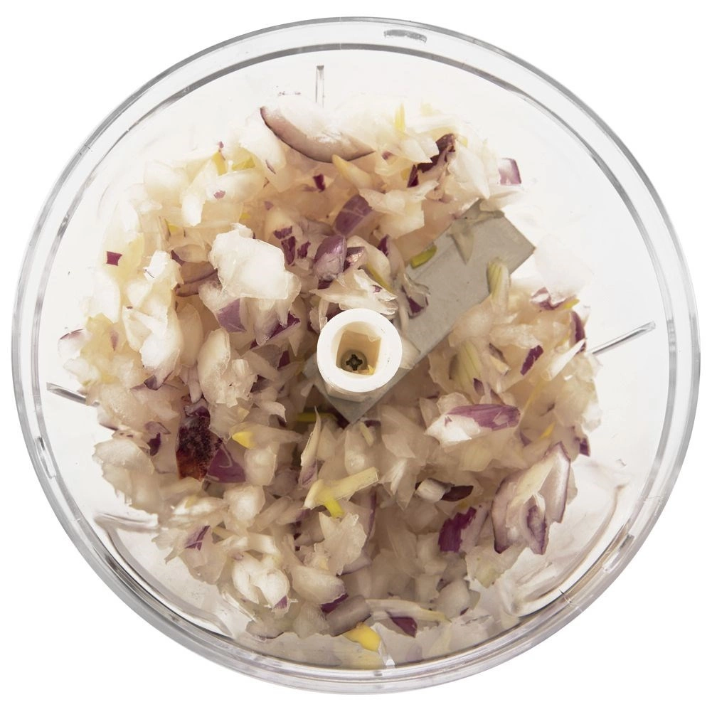 A transzparens edény lehetővé teszi az aprítási fok folyamatos nyomon követését. Az alján lévő csúszásgátló gyűrű biztosan a helyén tartja az aprítót.