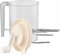 Praktikus kézi mixer kurblival és integrált, 1,5 l-es mérőkancsóval az egyszerű habveréshez, keveréshez és tésztakészítéshez. Az átlátszó edény pontos, ml- és literbeosztású skálával, a masszív fogantyú és a fröccsenésgátló fedél segítségével gyorsan és tisztán készíthető el a tejszínhab, a kemény tojásfehérjehab, a palacsintatészta és a mártások. Az áram nélküli mechanikus meghajtás, az ellenálló anyagok és a könnyű karbantartás megbízható segítőtárssá teszik minden konyhában.