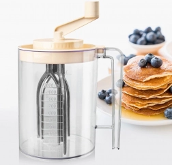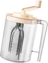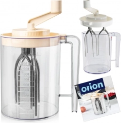 Az ORION kézi mixer egyesíti a habverőt, a keverőfejet és a mérőkancsót. Az átlátszó edény skálával (100–1000 ml és 1/4, 1/2, 3/4, 1 l) megkönnyíti az alapanyagok pontos adagolását. A mechanikus kurbli a belső habverőket hajtja, így hatékonyan keverhet áram nélkül, és az zárt fedélnek köszönhetően fröccsenésmentesen.