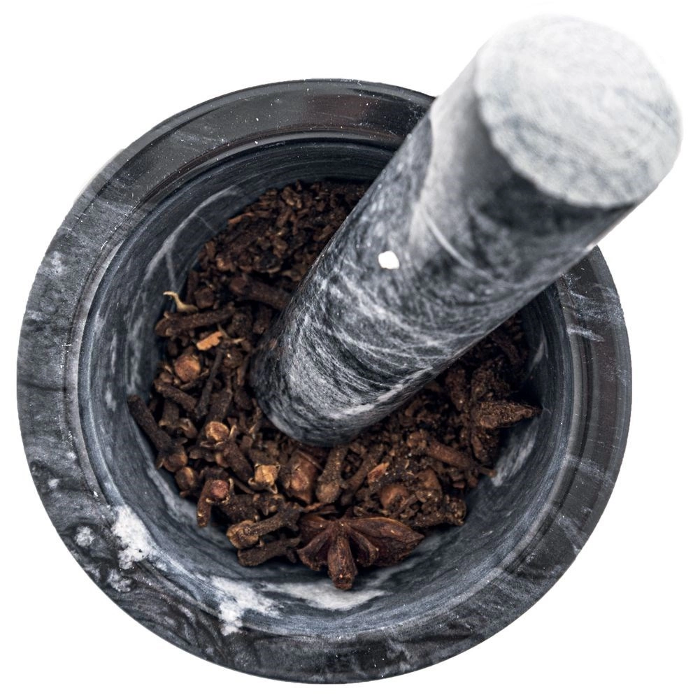 A tál belső, políroztatlan felülete és a törő alsó része tökéletes súrlódást biztosít. Könnyedén felszabadítja a fűszerek és gyógynövények illatát, valamint az illóolajokat.