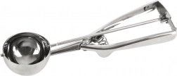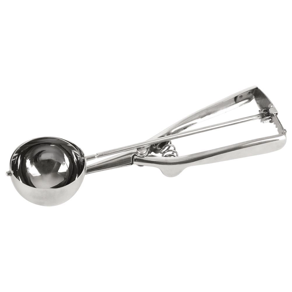 Ez a masszív rozsdamentes fagyigombócozó kanál 22,5 cm hosszú, 5,5 cm átmérőjű fejjel megkönnyíti az adagolást, és mindig egyforma, sima gombócokat biztosít. A automatikus kilökő kíméletesen választja le az adagot a fejről, így a tálalás gyors és tiszta.