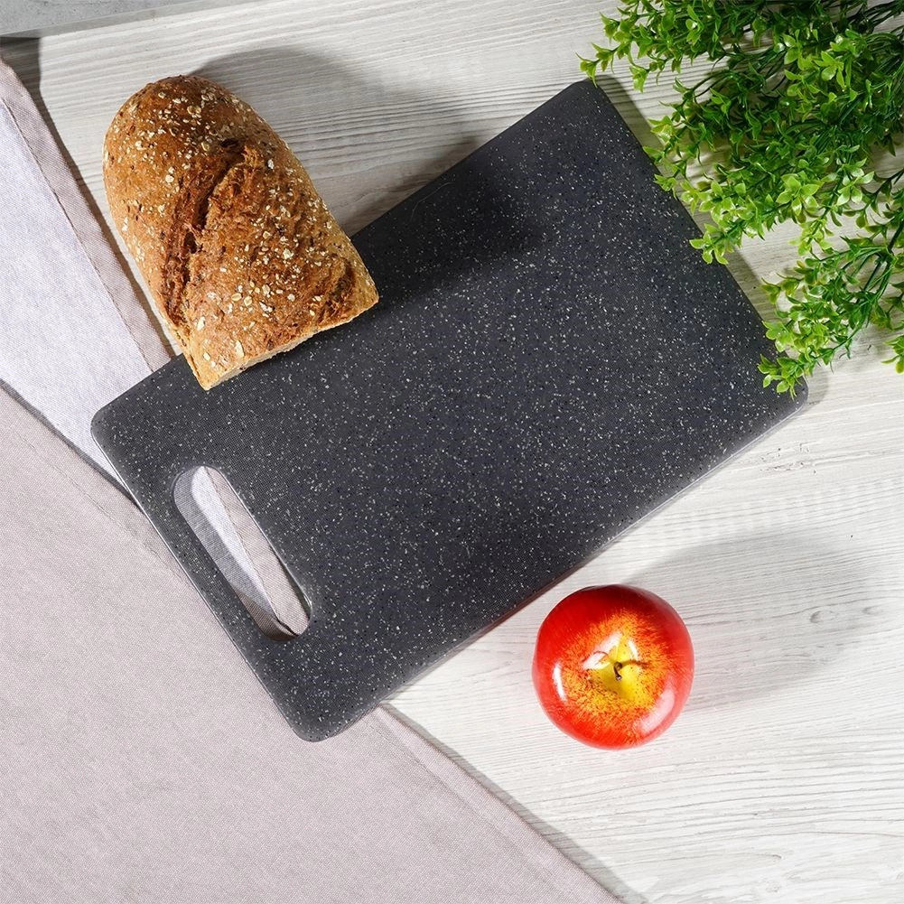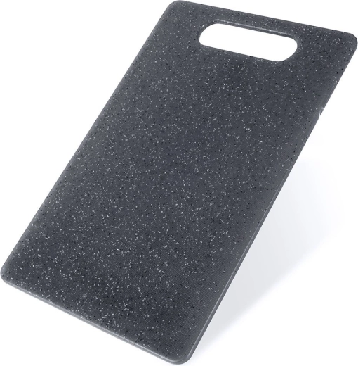 A szürke, tartós műanyagból készült, gránitot utánzó felületű vágódeszka remek választás minden konyhába. A 24 × 15 cm-es kompakt méret helytakarékos, mégis kényelmes munkafelületet kínál kenyér, gyümölcs, zöldség és hús szeleteléséhez. Az anyag kíméli a pengéket, és minden késhez megfelelő, beleértve a kerámiakéseket is.