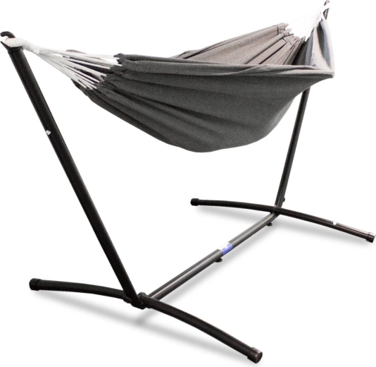 Az önálló, elegáns antracitszínű függőágy a tágas fekvőfelület kényelmét ötvözi a robusztus, porszórt acél vázzal. Kiegyensúlyozott felépítésének és csúszásgátló lábainak köszönhetően kültéri és beltéri használatra egyaránt ideális.