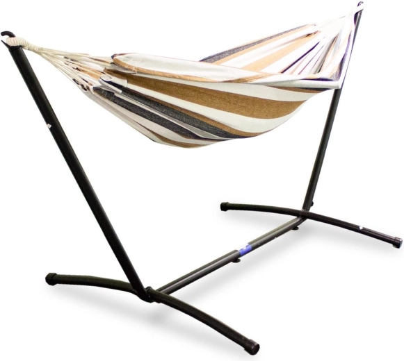 Élvezze a szabadidőt egy olyan függőágyban, amely ötvözi a kényelmet, a tartósságot és az egyszerű telepítést. A különálló állvány lehetővé teszi, hogy bárhová elhelyezze – a gyepre, a teraszra vagy akár beltérbe. A robusztus, porszórt bevonatú fém szerkezet stabilitást nyújt, míg a bézs-barna csíkos textil fekvőfelület puha és légáteresztő komfortot ad.