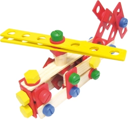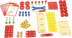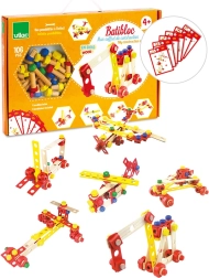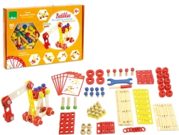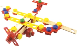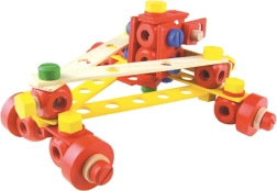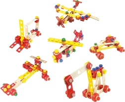 Színes és natúr lécek, csavarok, anyák, kerekek és csatlakozók segítségével a gyerekek járműveket és fantáziadús szerkezeteket állíthatnak össze, majd újra és újra átépíthetik őket.