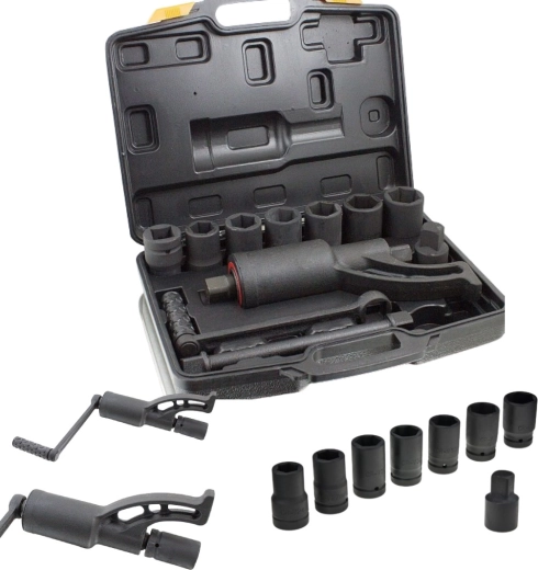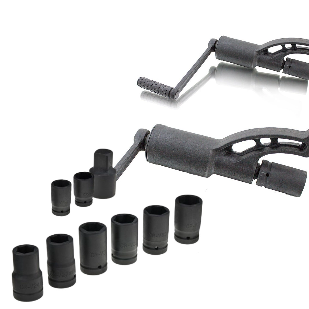 Nagy teljesítményű bolygóműves kerékanyakulcs TIR teherautókhoz 1:58 áttétellel és max. 5500 Nm nyomatékkal, amely könnyű csavar- és anyaoldást, illetve meghúzást biztosít áramellátás nélkül. A robusztus, króm-molibdén acél ház, a 7 darab 24–38 mm-es dugókulcs és a praktikus hordtáska megbízható segítőtársává teszik ezt a szettet terepen és műhelyben egyaránt.
