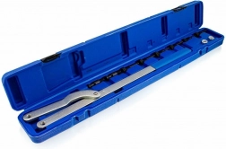 A BITUXX márka professzionális univerzális vezérműtengely-szíjtárcsa blokkoló kulcsa 40–220 mm állítható tartománnyal, cserélhető kúp alakú csapokkal és masszív acélszerkezettel rendelkezik. A 53 cm-es hossz ideális erőkart biztosít, kényelmes munkát téve lehetővé még nehezen hozzáférhető helyeken is. A készlethez praktikus műanyag koffer tartozik a biztonságos tároláshoz és szállításhoz.