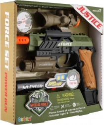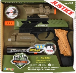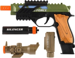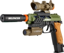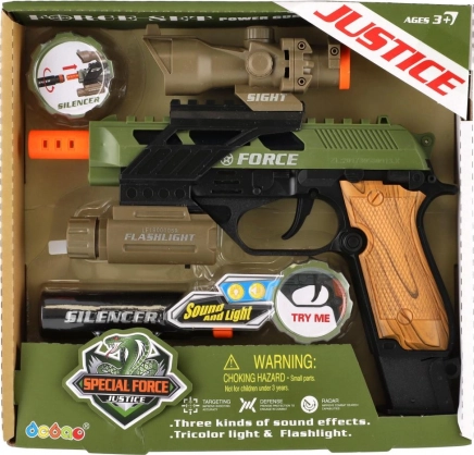 Valósághű megjelenésű műanyag pisztoly kis akciójáték-rajongóknak. Kínál fényhatásokat, hanghatásokat és praktikus kiegészítőket, mint célzó, zseblámpa és hangtompító. Elemmel működik, az elemek a csomag részét képezik.