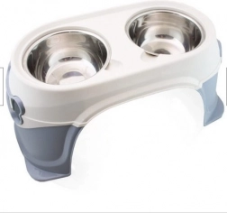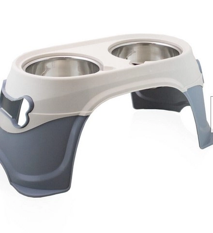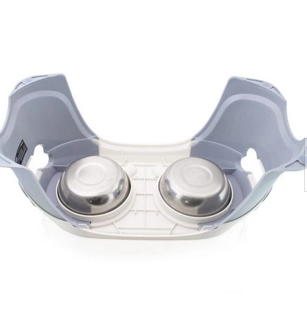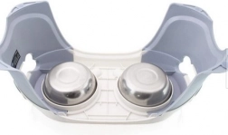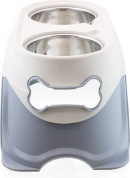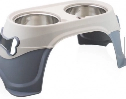 A stabil műanyag állványt csúszásgátló lábak egészítik ki, amelyek megakadályozzák az elmozdulást etetés közben. A megemelt peremek segítenek csökkenteni a tálak körüli rendetlenséget, a praktikus csont alakú fogantyúk pedig megkönnyítik a kezelést. Ideális megoldás az eledel és a víz egyidejű tálalásához.