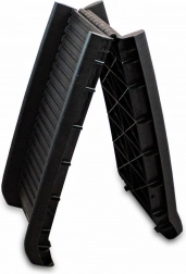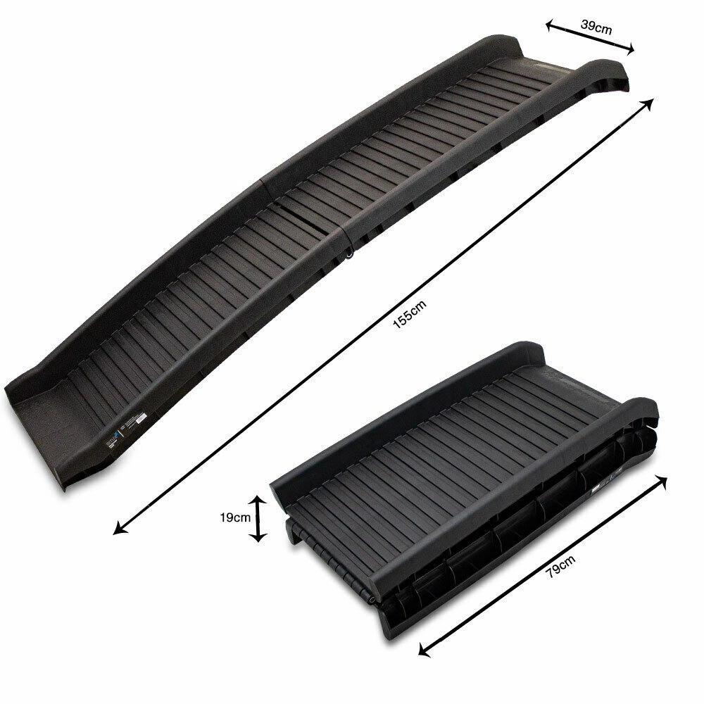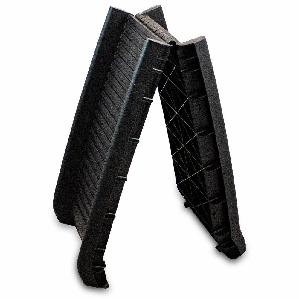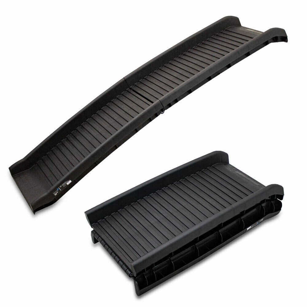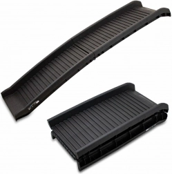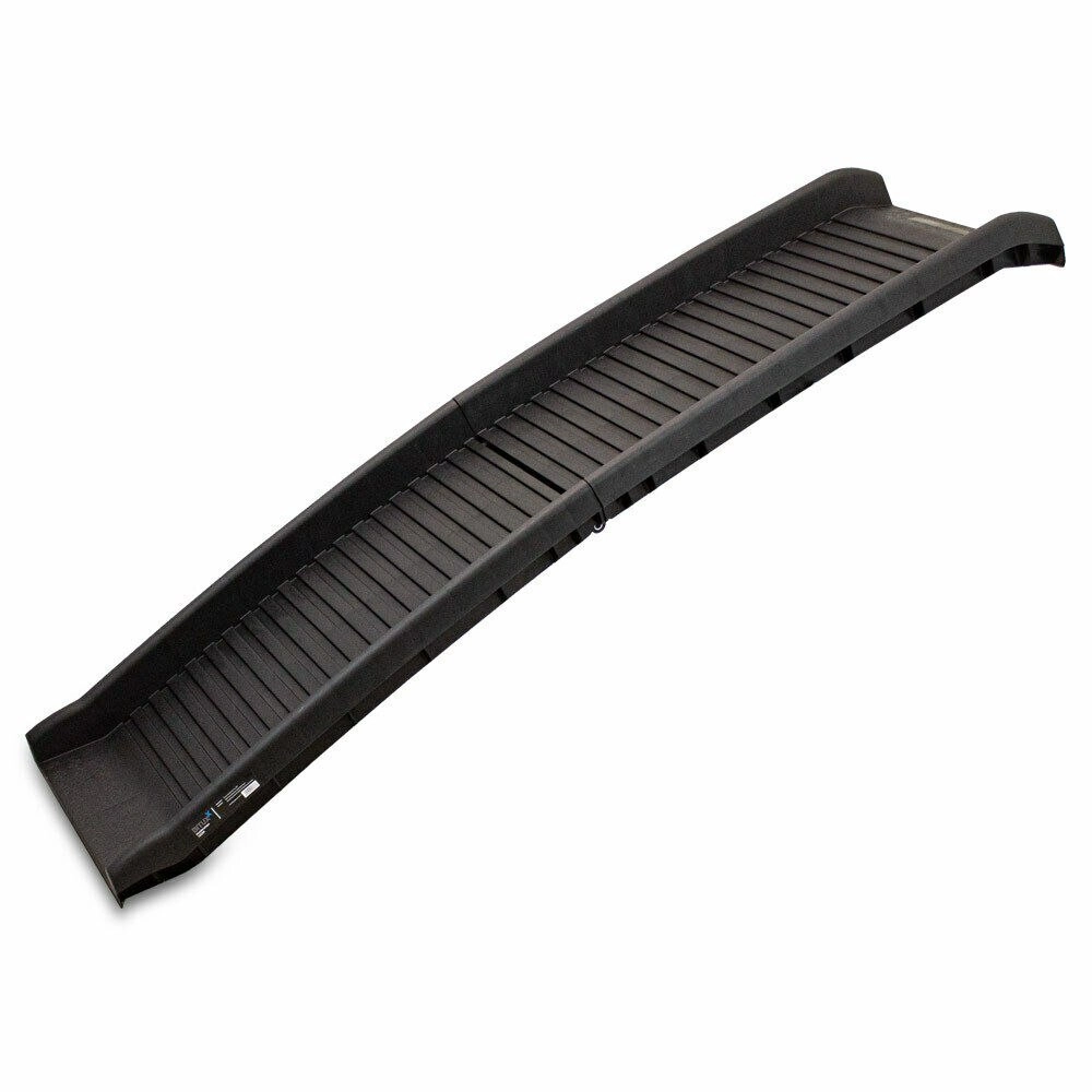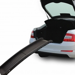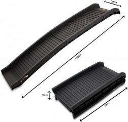A mindössze 5 kg-os tömegnek és az összecsukható kialakításnak köszönhetően a rámpa könnyen szállítható és elfér a csomagtartóban. A gumiborítású érintkezőfelületek megóvják a lökhárító festését, amikor a rámpát az autóra támasztja. A karbantartás gyors – a felület egyszerűen letörölhető.