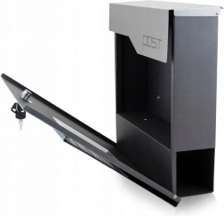Modern, kültéri levélszekrény újságtartó csővel, amely elegáns megjelenést és praktikus részleteket egyesít. A grafit szín és a rozsdamentes elemek kombinációja remekül illik a modern homlokzatokhoz. Tágas, kulccsal zárható, és tartós, porszórt acél szerkezettel rendelkezik a hosszú élettartamért.