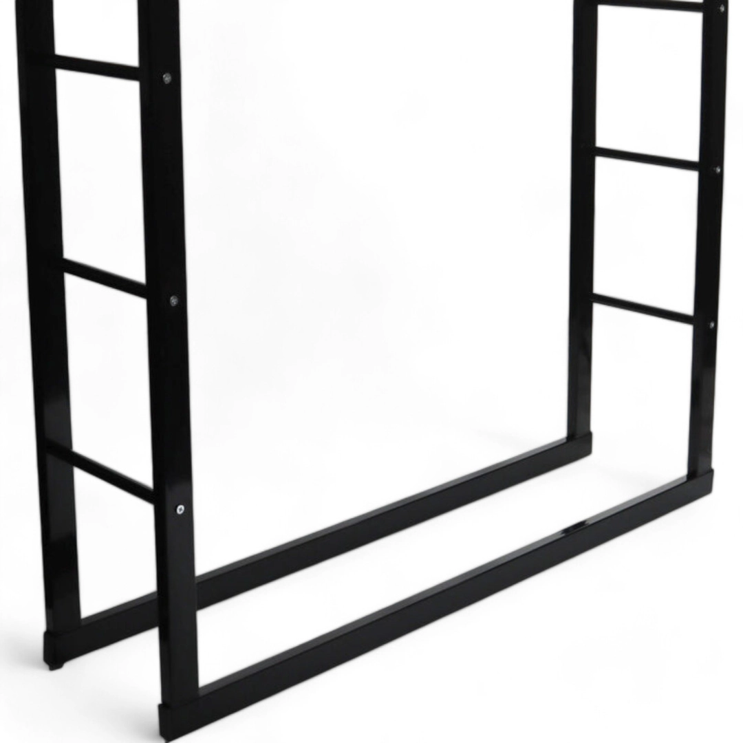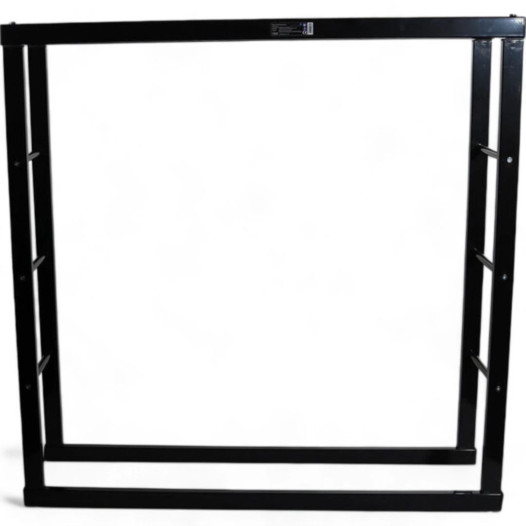 Elegáns tűzifaállvány 100 × 25 × 100 cm méretben, ideális a rend megtartásához a kandallónál és a teraszon. Modern loft megjelenése, tartós acélszerkezete és matt fekete színe bármely enteriőrbe illik. Kompakt szélességének és stabil, teljesen hegesztett kialakításának köszönhetően biztonságos és áttekinthető rönktárolást kínál jó légáramlással.