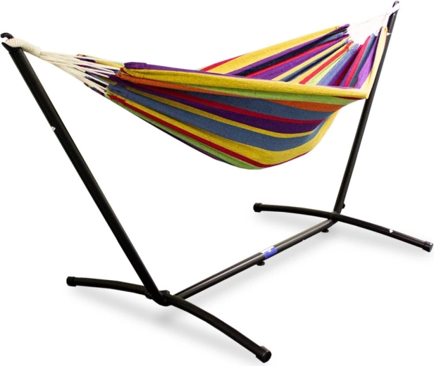 Élvezze a tökéletes pihenést a kertben vagy a teraszon bárhol. Ezt a stabil szettet egy masszív fém állvány és egy kényelmes, színes textil függőágy alkotja. Az önálló állványnak köszönhetően nincs szükség fára, a telepítés gyors és egyszerű. A széles fekvőfelület kellemesen alkalmazkodik a testhez, és maximális komfortot nyújt a relaxációhoz.