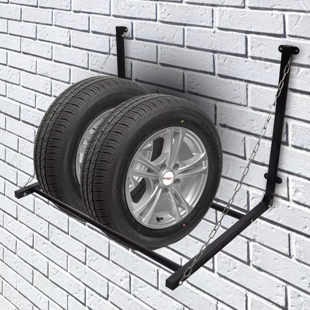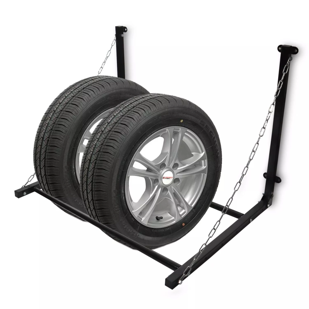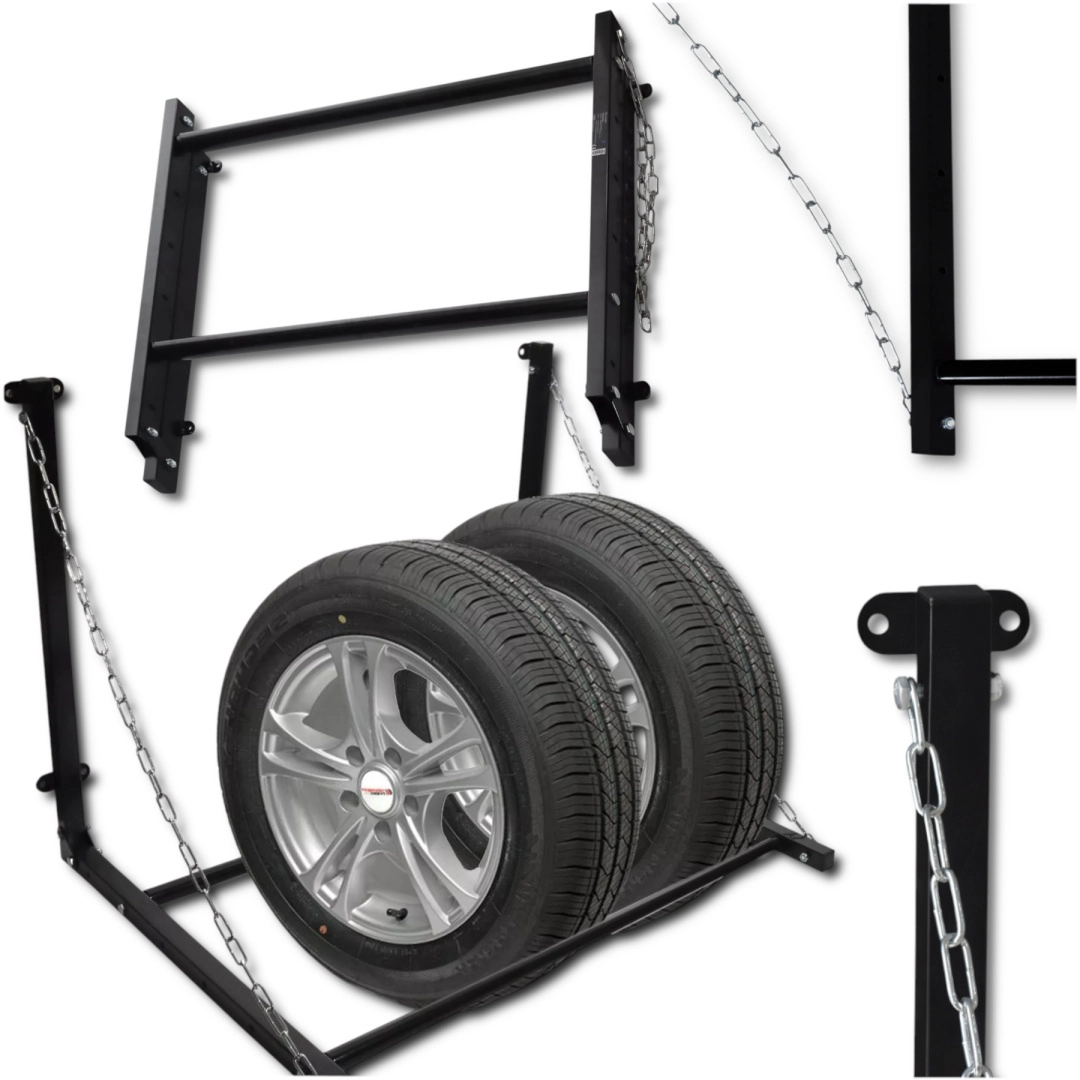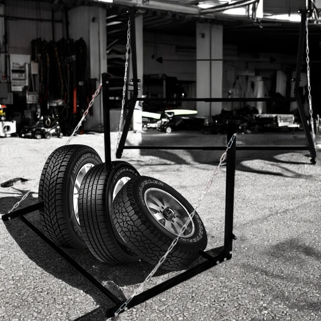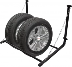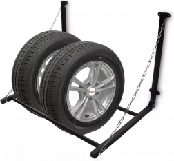 Masszív acélszerkezet láncos rögzítéssel, amely biztonságosan elbír akár négy kereket vagy abroncsot.