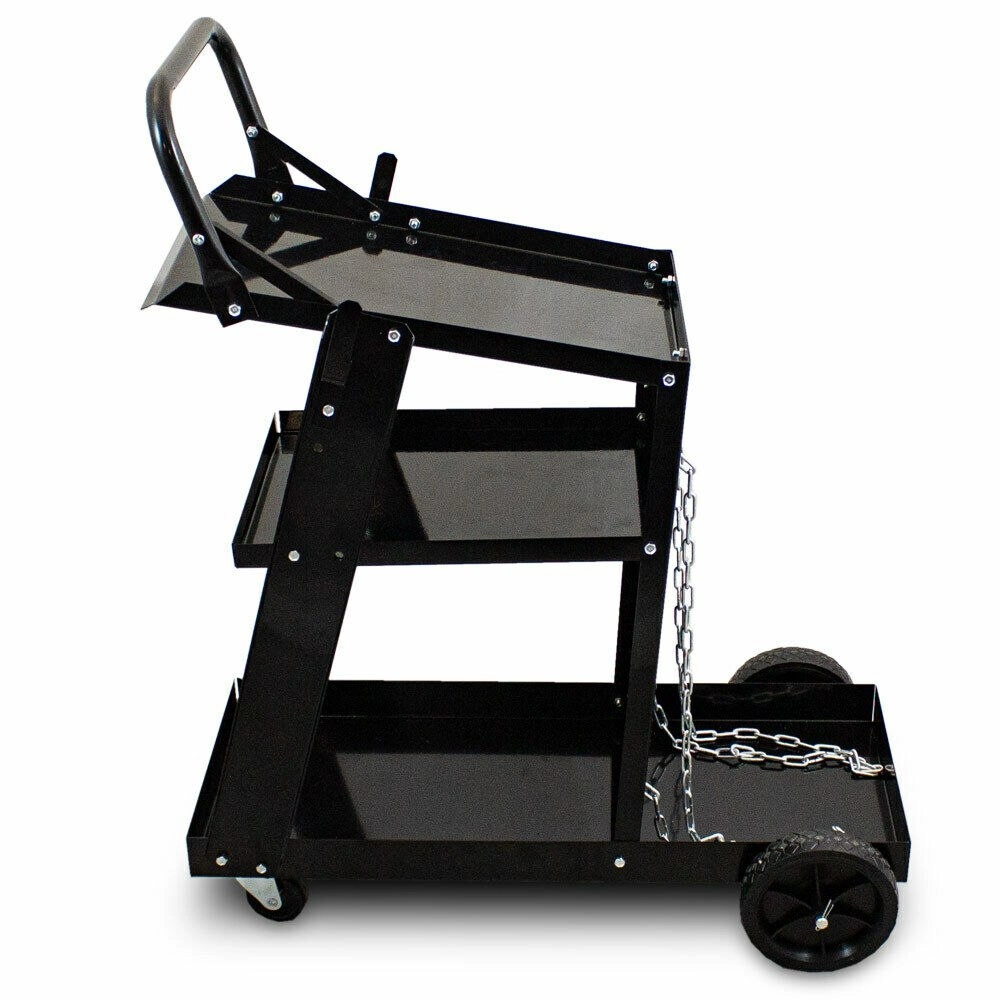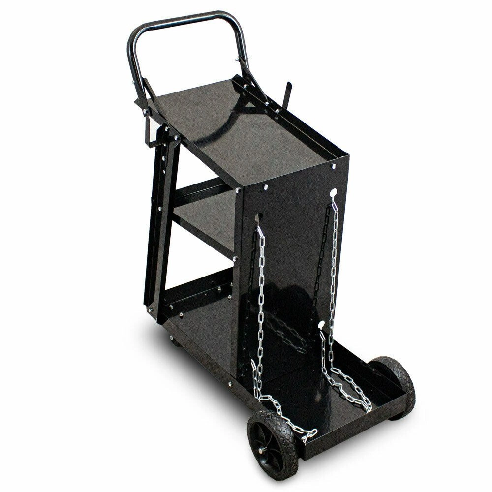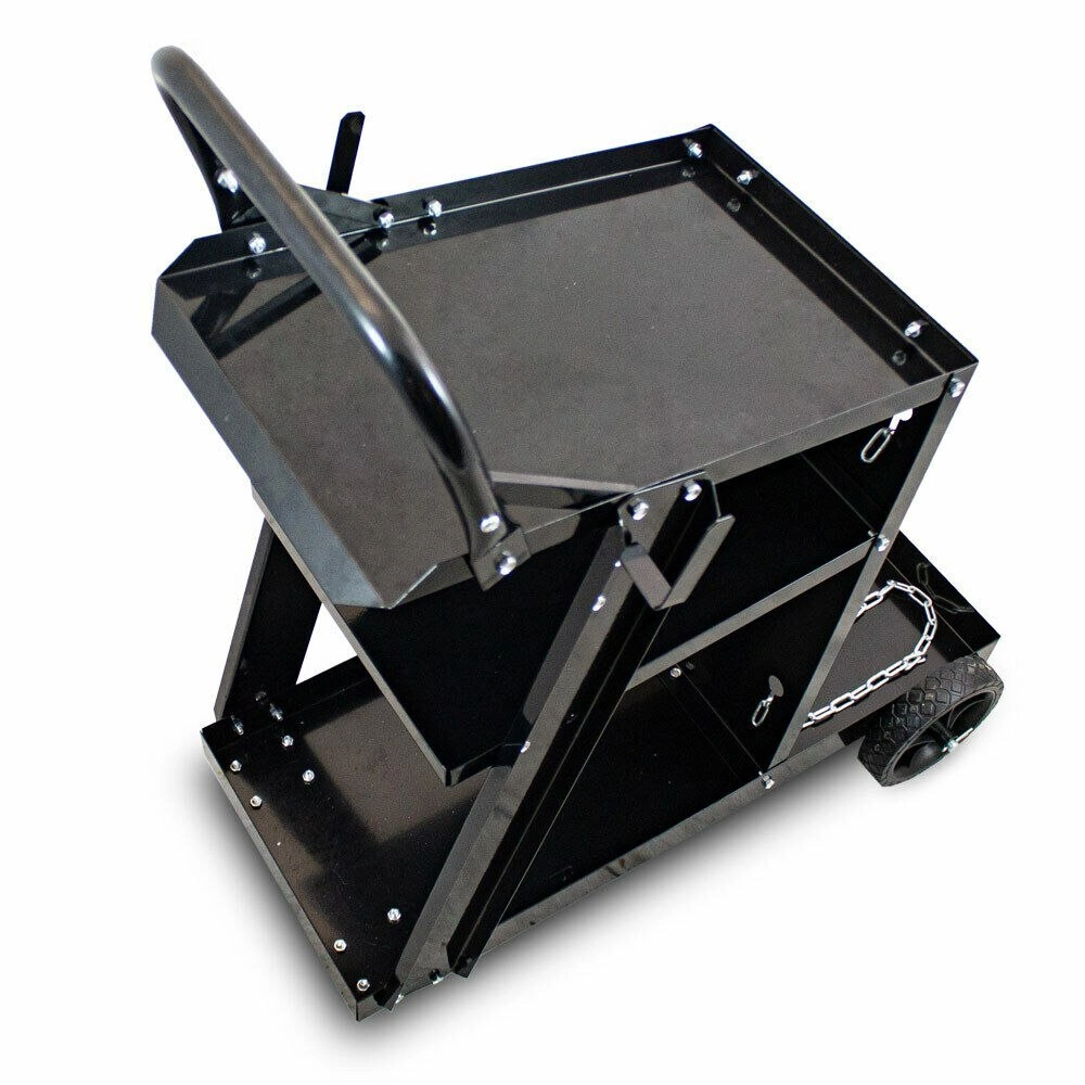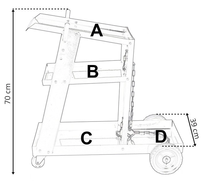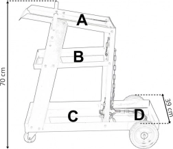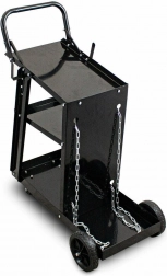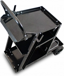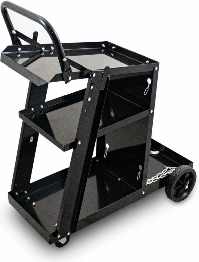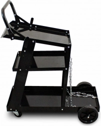 Praktikus hegesztőkocsi műhelybe és garázsba, 40 kg teherbírással, 3 rakodópolccal és gázpalacktartóval láncos rögzítéssel. Masszív acél szerkezet, nagy hátsó kerekek és első forgó görgők biztosítják a hegesztőgépek, tartozékok és gázfelszerelés könnyű kezelését és biztonságos szállítását.