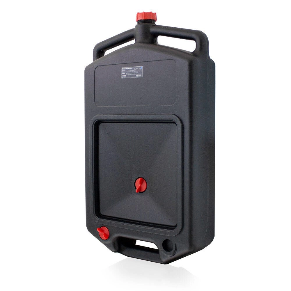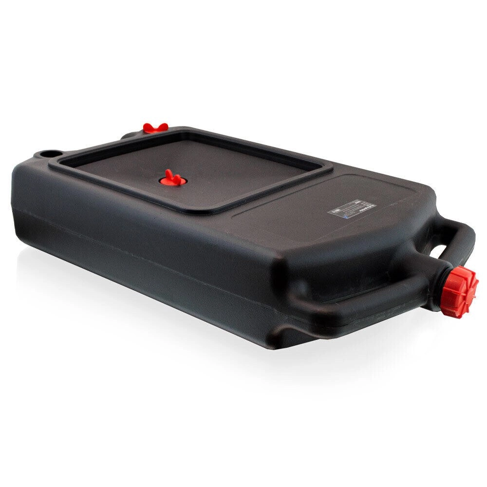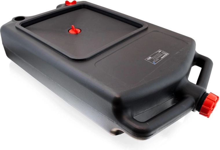 Ez a strapabíró műanyag edény a használt motorolaj és más autóipari folyadékok könnyű felfogására és szállítására készült. Az alacsony magasság és a széles felfogó felület megkönnyíti a csöpögésmentes leeresztést, míg a menetes kupakok tömítéssel megakadályozzák a szivárgást szállítás közben.