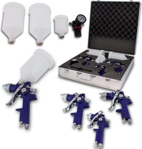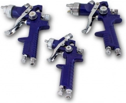 Professzionális és hobbi felhasználás egyben: ez a készlet három HVLP festékszóró pisztolyt tartalmaz 1,7 mm, 1,4 mm és 1,0 mm fúvókákkal a bevonatok széles skálájához. A HVLP technológia csökkenti a ködképződést, és lehetővé teszi az anyag akár 30%-os megtakarítását. Rozsdamentes acél a hosszú élettartamért, fém koffer a biztonságos tároláshoz és szállításhoz. Figyelem: a kompresszor és a festékek nem tartozékok.