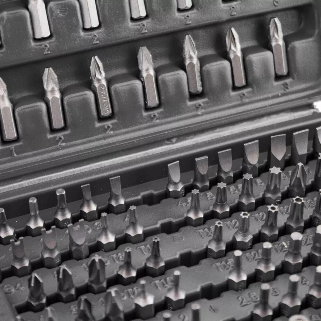 A masszív műanyag tok minden bitet a helyén tart, így mindig rend és gyors hozzáférés biztosított. A kompakt méreteknek köszönhetően ideális a műhelybe, autóba és utazáshoz is.