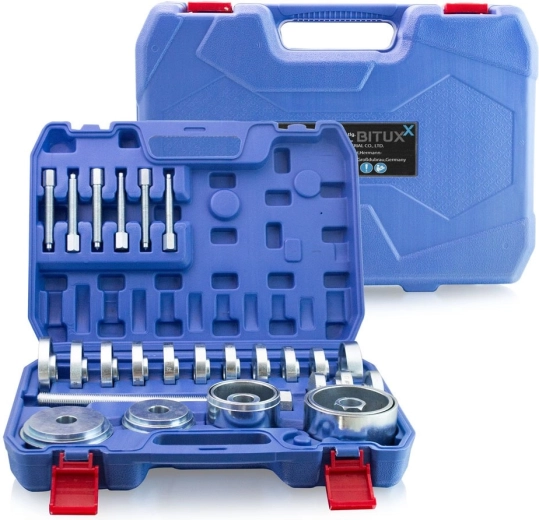 Professzionális készlet a kerékcsapágyak gyors és hatékony szereléséhez és szétszereléséhez elsőkerék-hajtású járműveken. Alkalmas szabványos autóipari csapágyakhoz, és lehetővé teszi a cserét a csonkállvány és a lengéscsillapító kiszerelése nélkül. Masszív műanyag kofferben szállítva – ideális garázsba, műhelybe és professzionális használatra is.