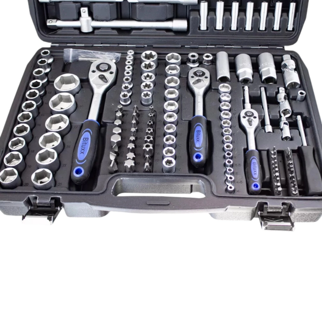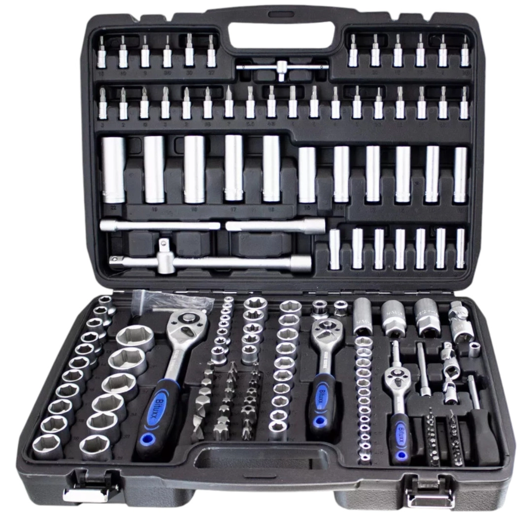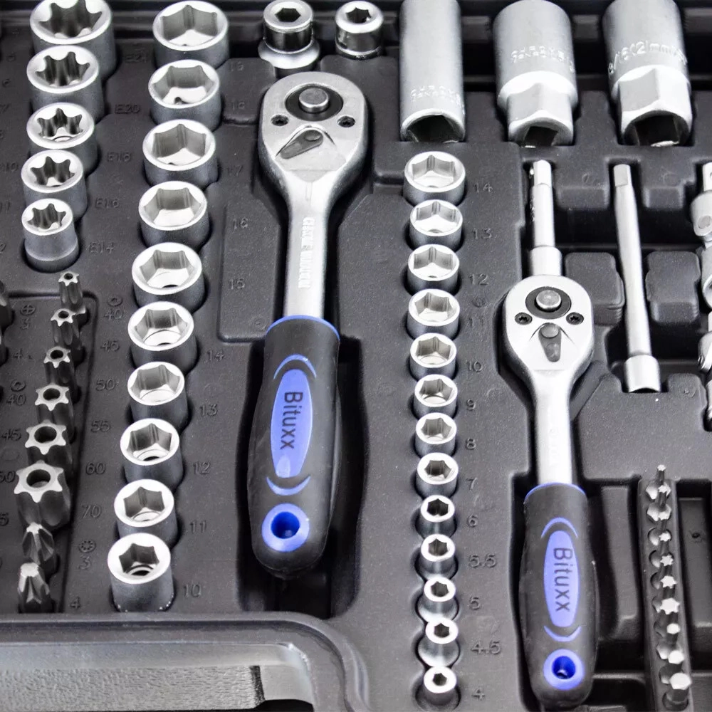 Ez az átfogó készlet egyesíti az 1/4”, 3/8” és 1/2” dugókulcsok széles választékát, a racsnikat, hosszabbítókat, adaptereket és kulcsokat a kötőelemek gyors és pontos lazításához és meghúzásához. A króm–vanádium acél (CrV) nagy tartósságot és hosszú élettartamot biztosít, míg a masszív ABS bőrönd mindent áttekinthetően és mindig kéznél tart.