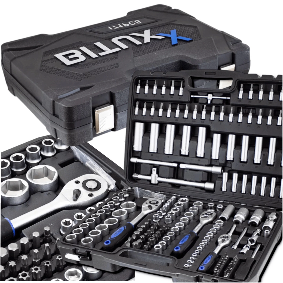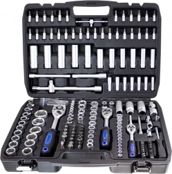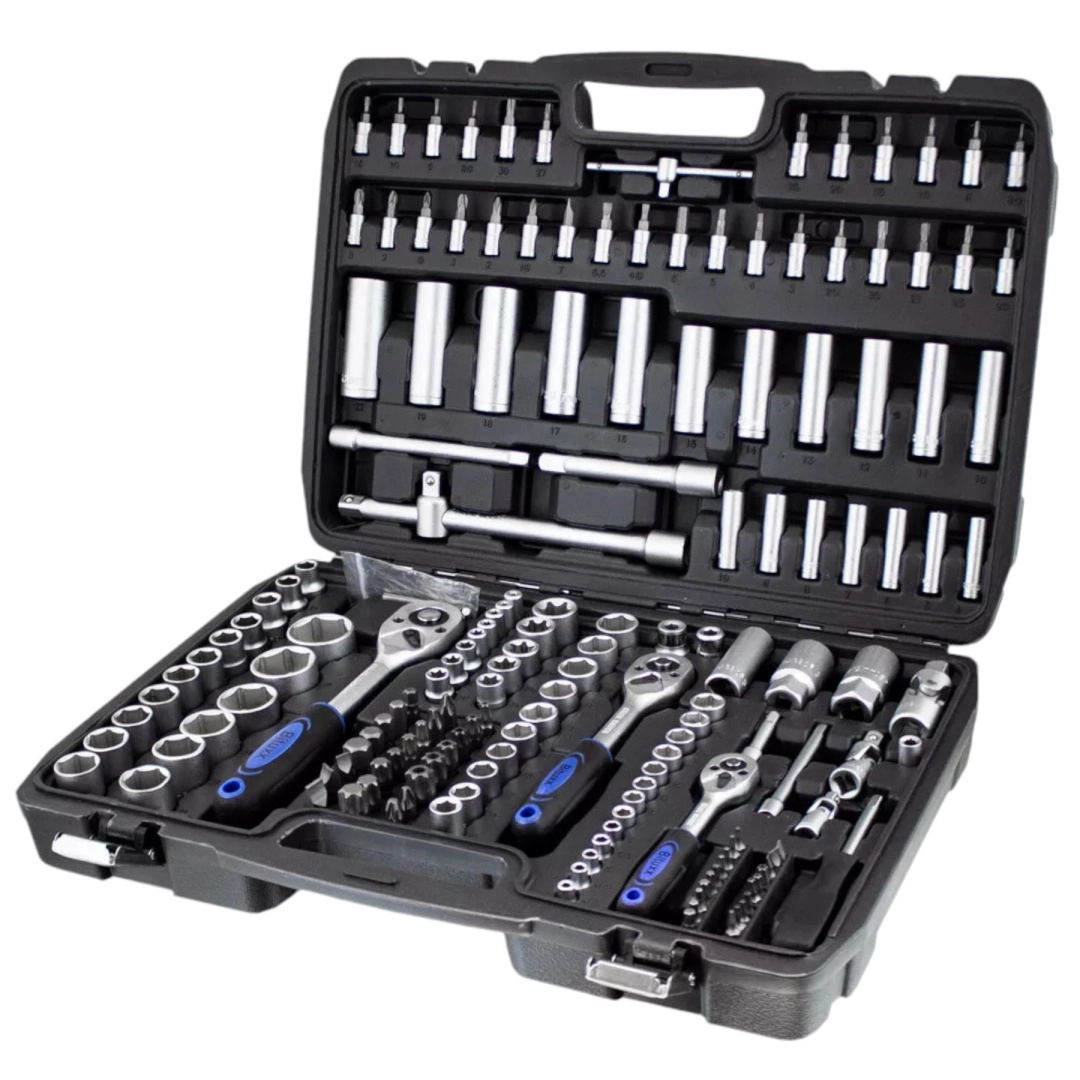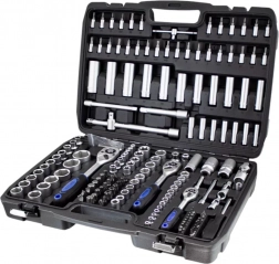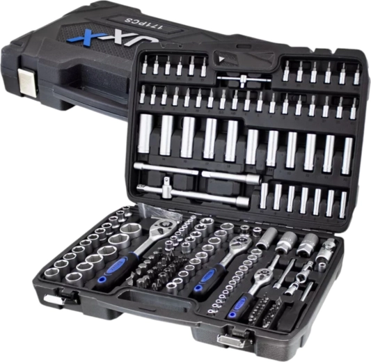 Univerzális 171 részes szerszámkészlet króm-vanádium acélból (CrV) műhelybe, szervizbe és otthoni garázsba. Tartalmaz dugókulcsokat, racsnikat, biteket, hosszabbítókat, csuklókat és imbuszkulcsokat strapabíró ABS műanyag bőröndben az áttekinthető tároláshoz és a könnyű szállításhoz. Ideális autószereléshez, szerelési munkákhoz és általános javításokhoz.