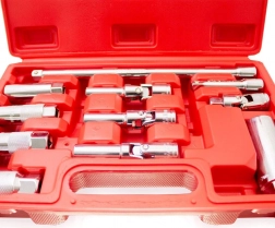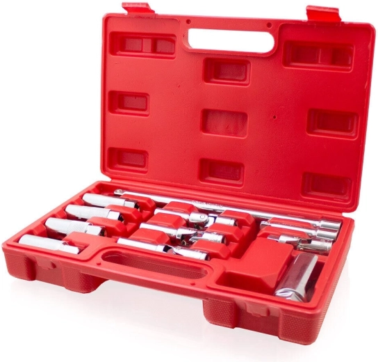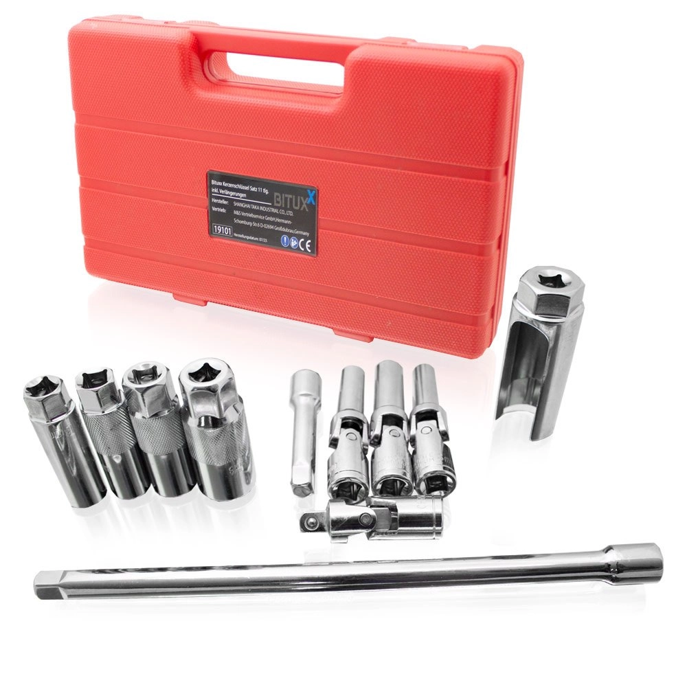 A BITUXX 11 darabos gyertyakulcs-készlete otthoni műhelyekhez és professzionális szervizekhez egyaránt készült. A minőségi Cr-V acél nagy szilárdságot, kopás- és korrózióállóságot biztosít. A standard, hosszú és csuklós toldatok kombinációjával a gyertyák szűk helyeken is biztonságosan és hatékonyan elérhetők.