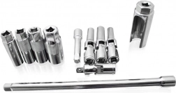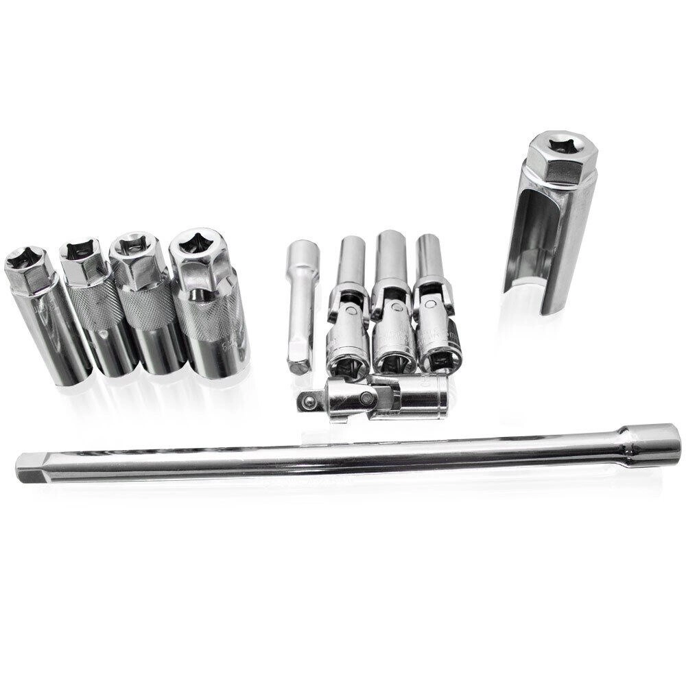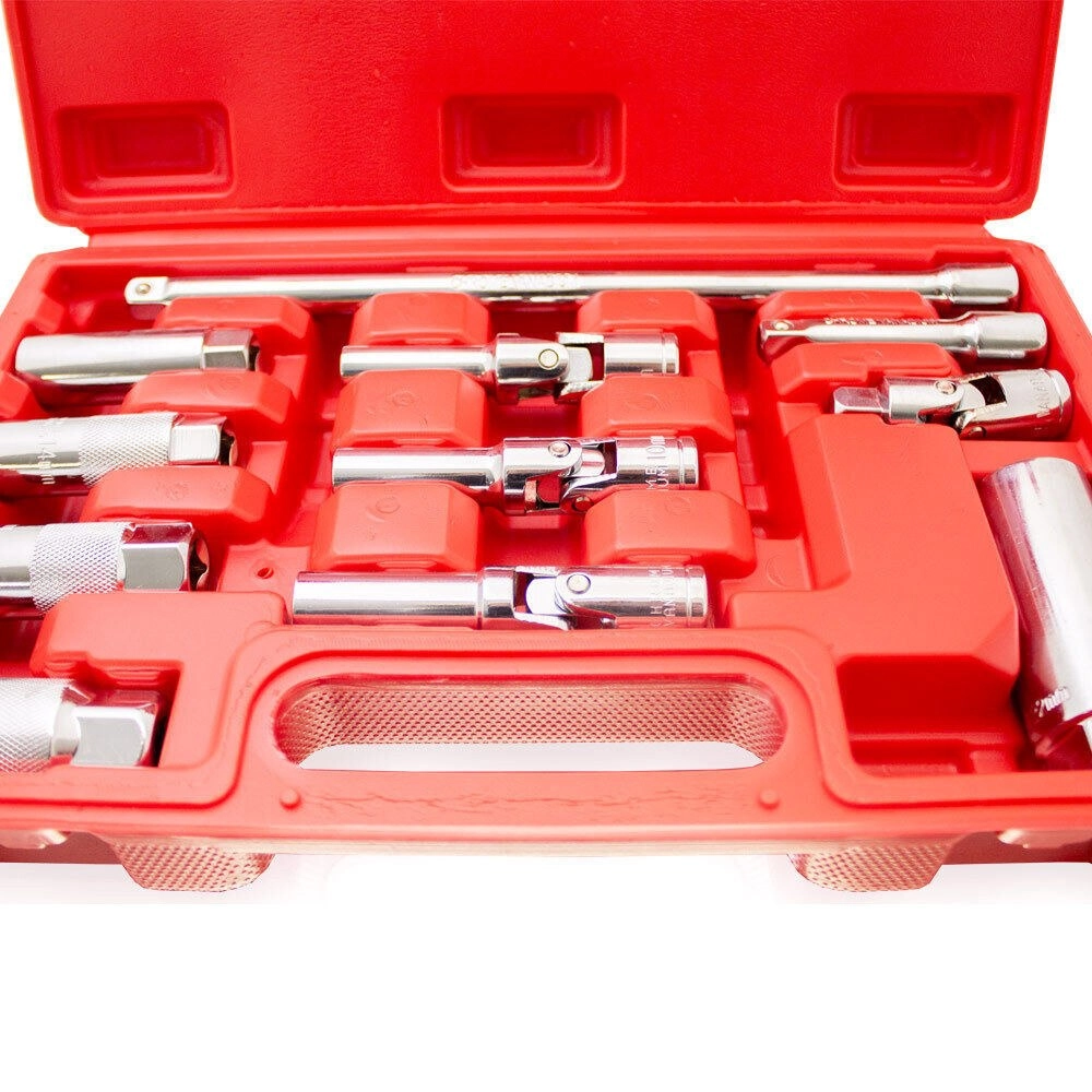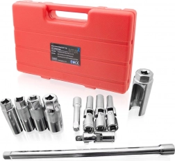 A készlet a leggyakoribb gyertyatoldat-méreteket tartalmazza (16/14/21 mm), valamint praktikus hosszabbító rudakat (250 és 76 mm) a jobb eléréshez. A csuklós adapter és az univerzális csuklók megkönnyítik a szög alatti munkát, míg a masszív koff er minden elemet a helyén és használatra készen tart.