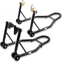 Komplett motorkerékpár-emelő állványkészlet első és hátsó kerékhez a könnyű szervizeléshez, javításhoz és tároláshoz. Biztosítja a magas stabilitást, 250 kg teherbírást állványonként és állítható szélességet különböző motorkerékpár-típusokhoz. Tartós acél szerkezet 32 mm csőátmérővel és fekete felületkezeléssel a karcolásokkal és korrózióval szembeni védelemért.